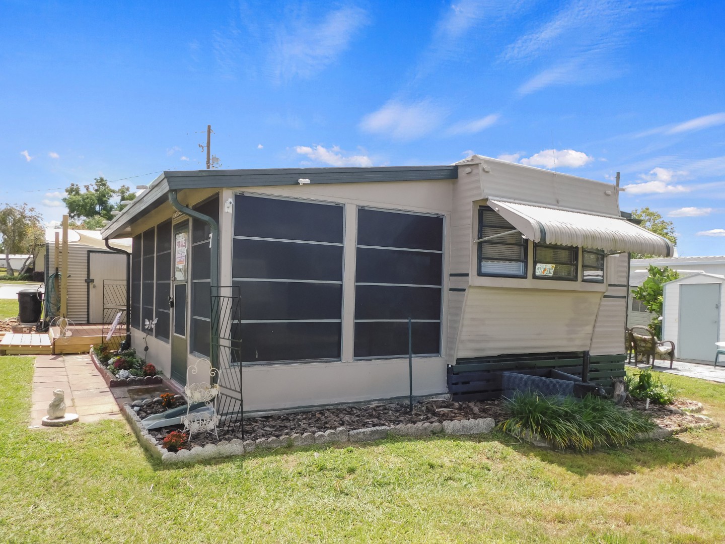 Monthly Lot Rent: $518.00 | Blue Jay RV Park | Park Trailer + Florida Room | 1 Bed | 1 Bath | Shed With Laundry | Newer Central AC | Close To Pool And Amenities ~ Immediate Move In