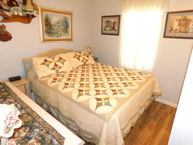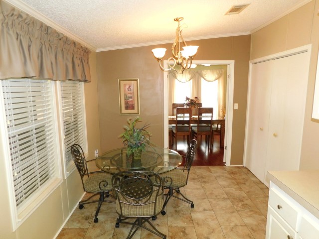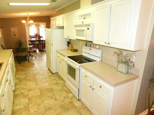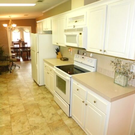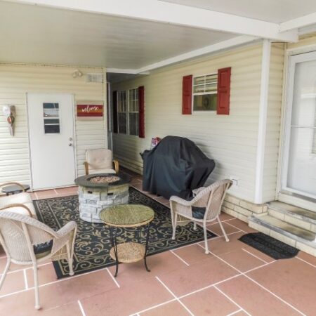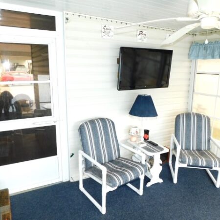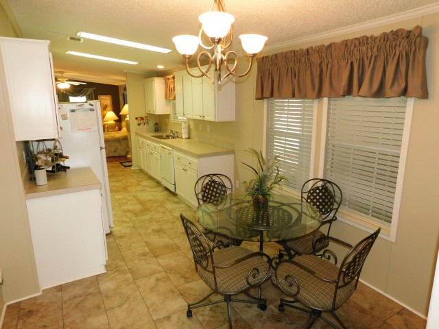 INTERIOR LAYOUT: Modern galley kitchen with 5×10 breakfast nook, laundry room off of kitchen, 14×14 living room, 10×26 veranda room/dining room, 10×12 raised Florida room with vinyl windows, 12×13 master bedroom with walk in closet, 9×9 guest bedroom with standard closet