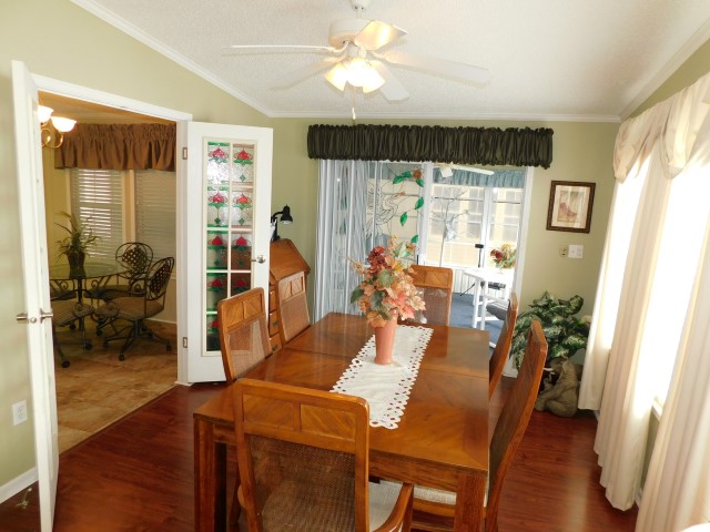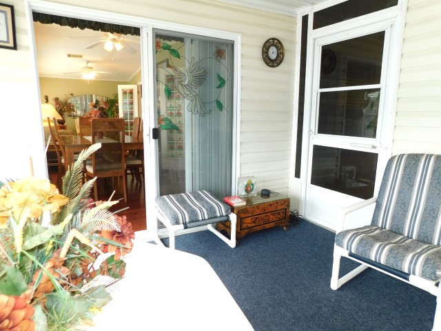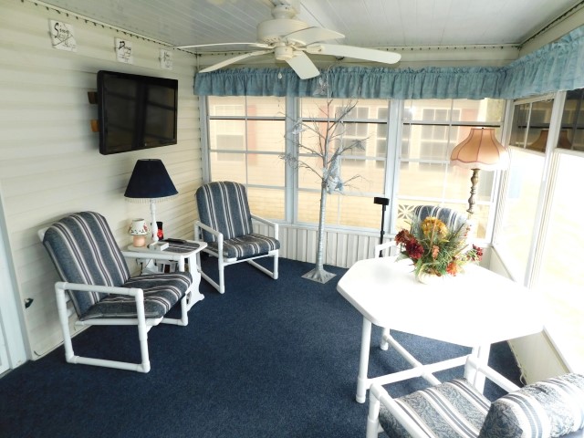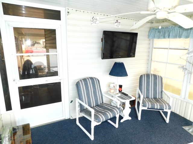 FLORIDA ROOM: Table, four patio chairs, lamp table, TV, ceiling fan