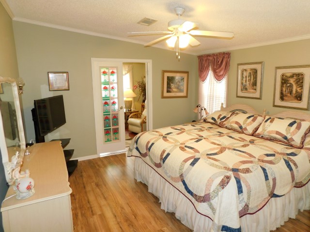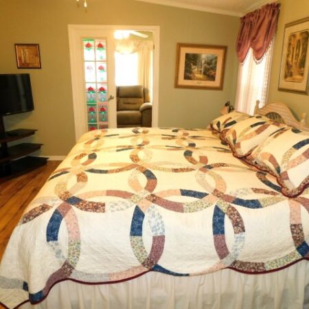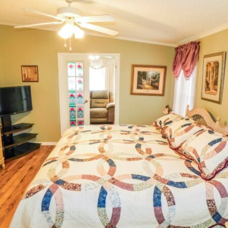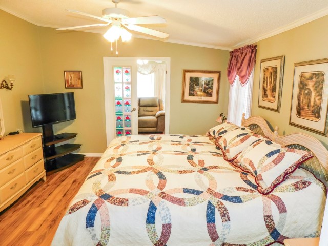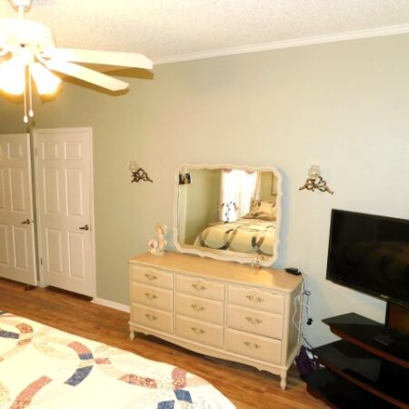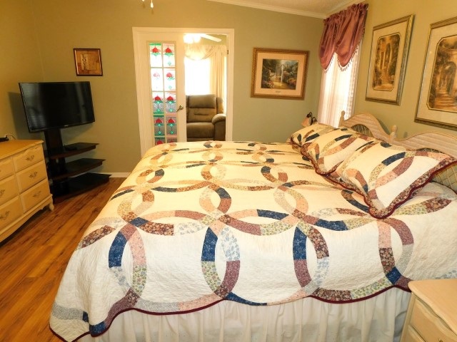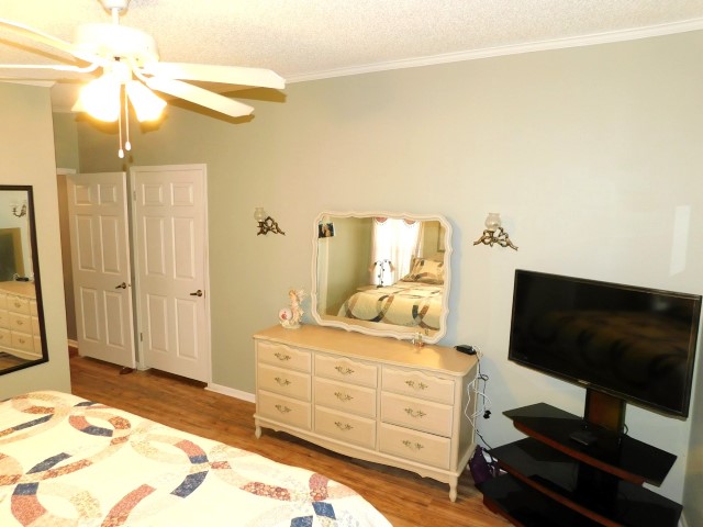 MASTER BEDROOM: King bed, dresser with mirror, two nightstands, two table lamps, TV and stand, lighted ceiling fan
