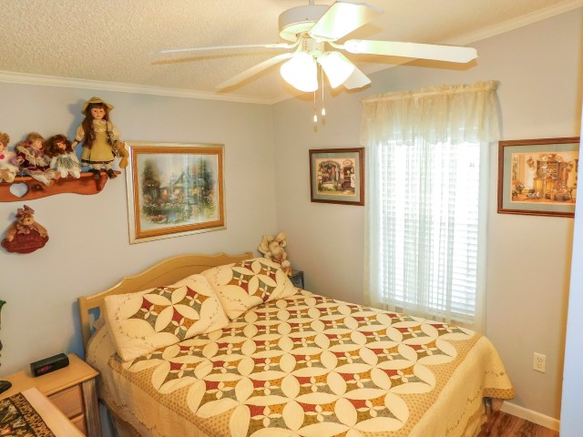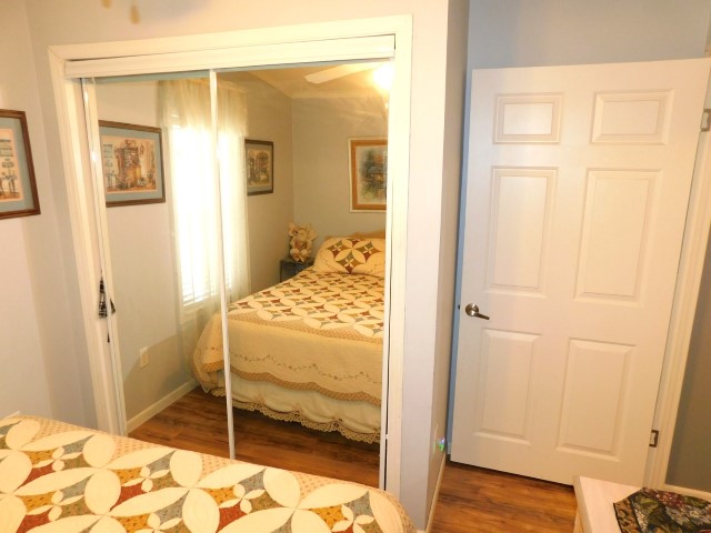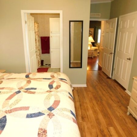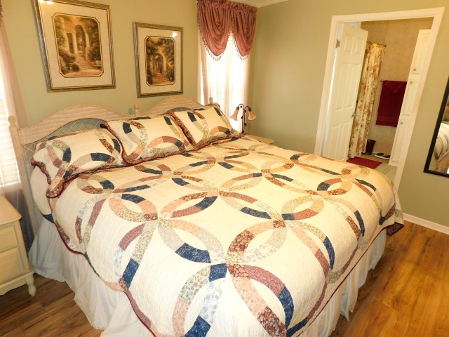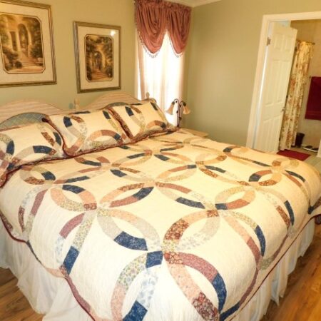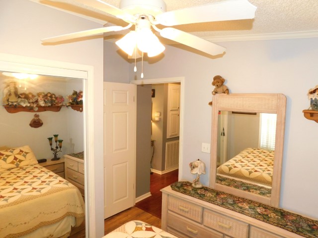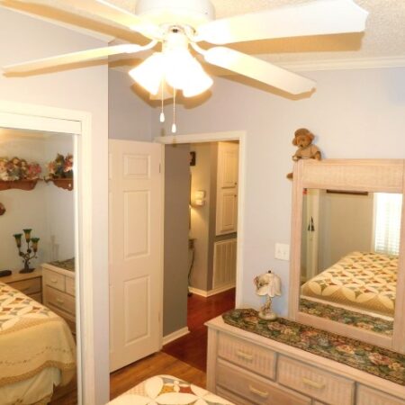 GUEST BEDROOM: Queen bed, dresser with mirror, two nightstands, two table lamps, lighted ceiling fan