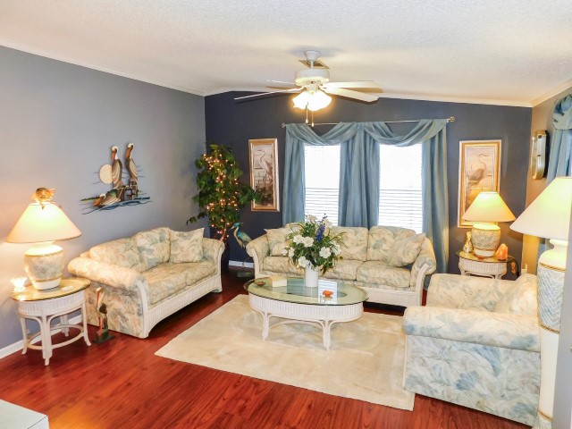 LIVING ROOM: Sofa, loveseat, chair and ottoman, coffee table, two end tables, two table lamps, floor lamp, lighted ceiling fan