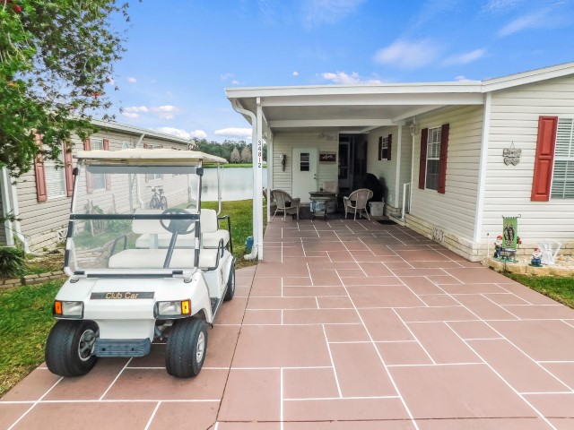 EXTERIOR: Ivory vinyl siding with white trim, newer (2020) asphalt shingle roof, widened resurfaced driveway, carport/covered patio, open back patio overlooking lake, 9×10 attached storage shed, lakeside lot