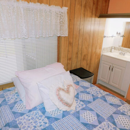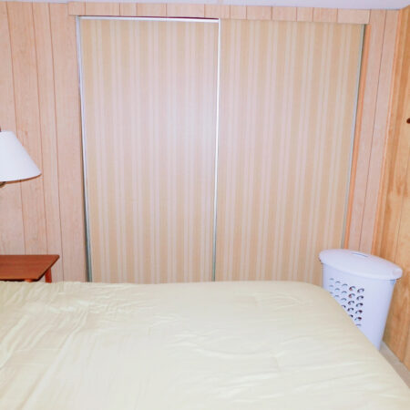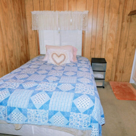 GUEST BEDROOM: Full size bed, chest of drawers, lighted ceiling fan