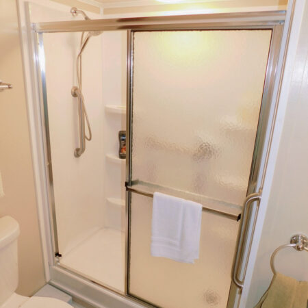 NICELY UPDATED BATHROOM: Walk-in shower, single vanity, medicine cabinet, and wall cabinet
