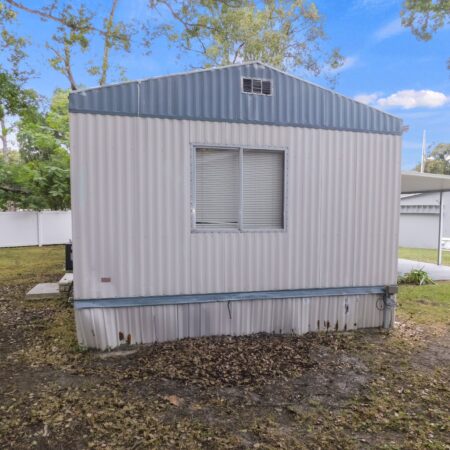 EXTERIOR: Ivory metal siding with light blue trim, coated metal roof, carport, long driveway, 9×9 attached storage shed, lot location next to community clubhouse and activities