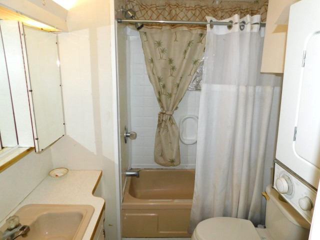 LAUNDRY ROOM/BATHROOM: Stacked Whirlpool washer and dryer