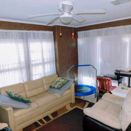 LIVING ROOM: Sofa, loveseat, recliner, lighted ceiling fan