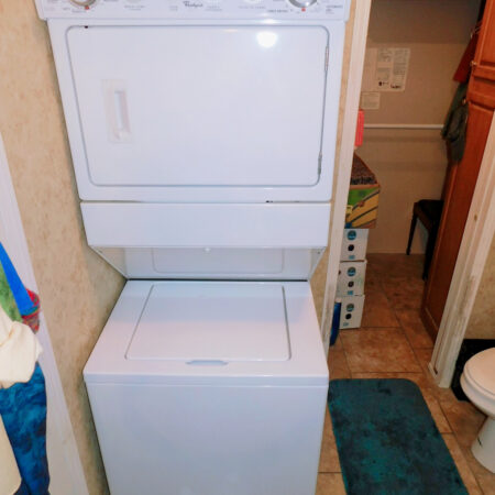 BATHROOM/LAUNDRY ROOM: Stacked Whirlpool washer and dryer