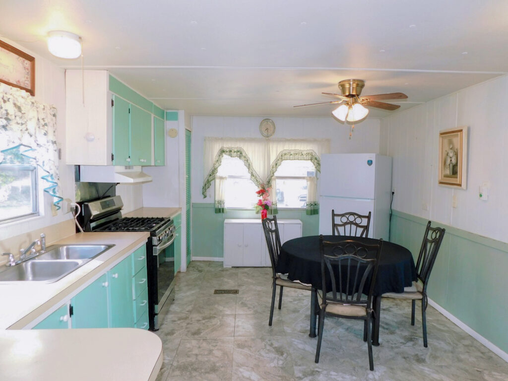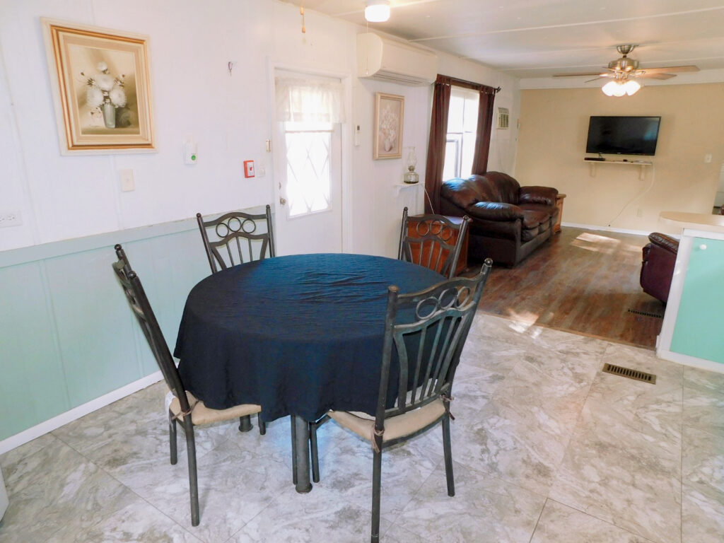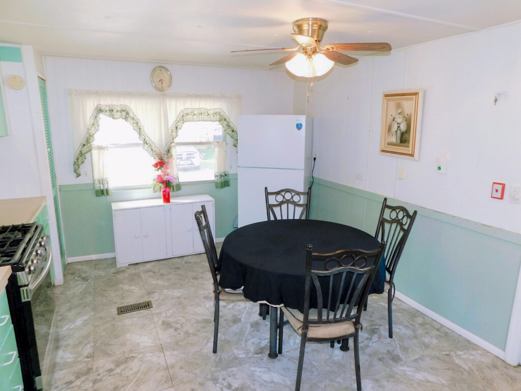 DINING AREA: Table, four chairs, lighted ceiling fan