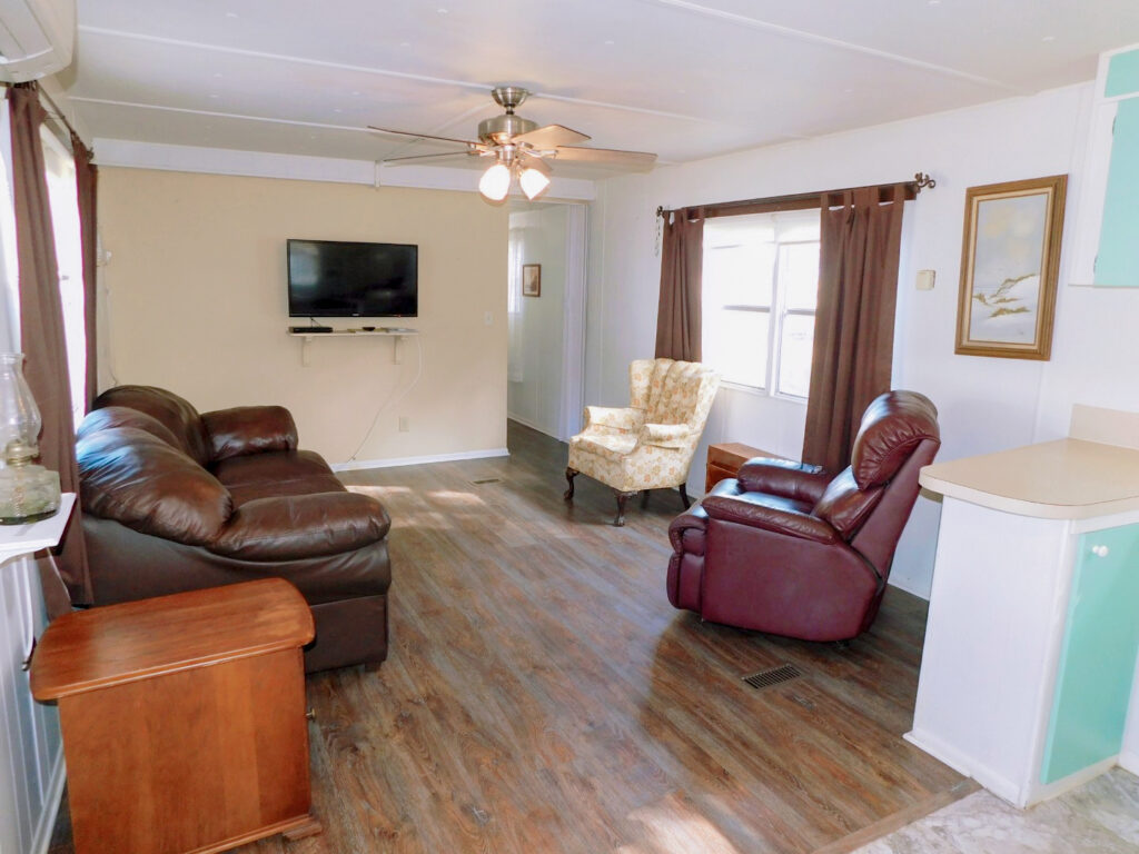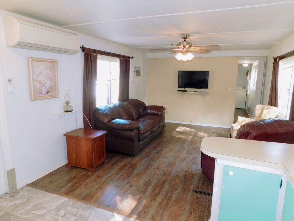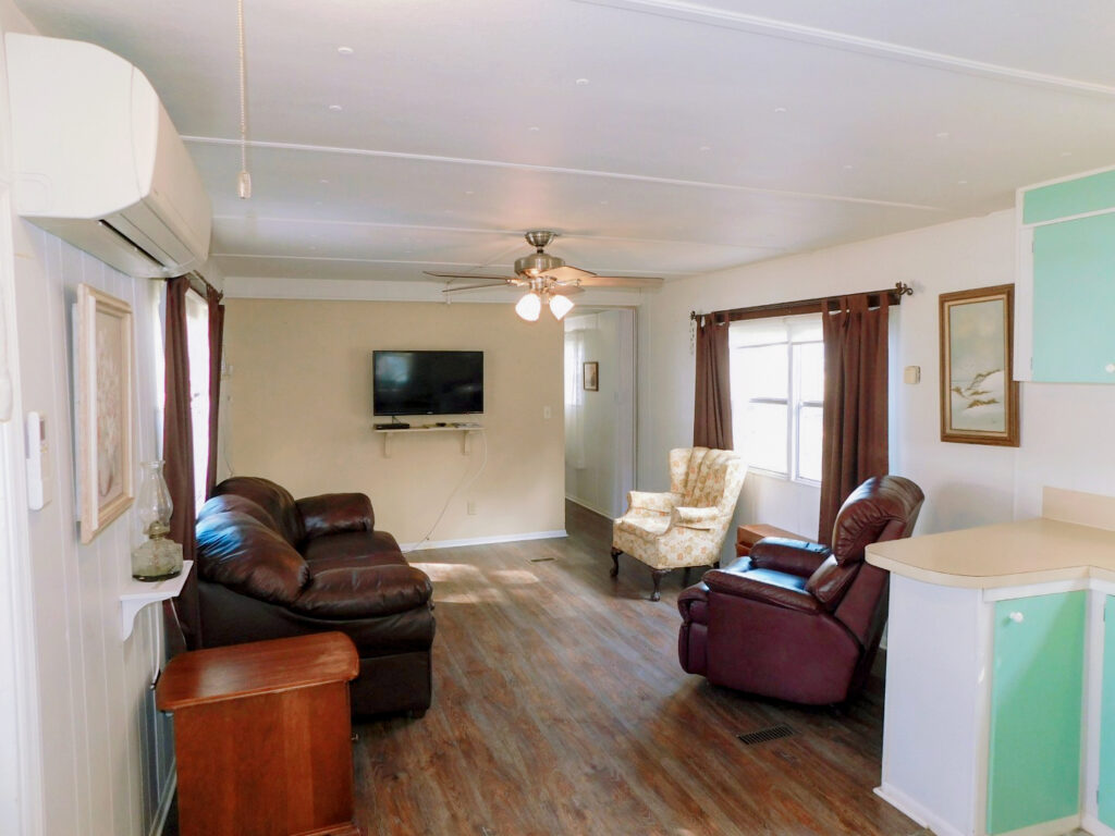 LIVING ROOM: Sofa, recliner, chair, two end tables, TV, lighted ceiling fan, Daikin Mini-Split A/C unit