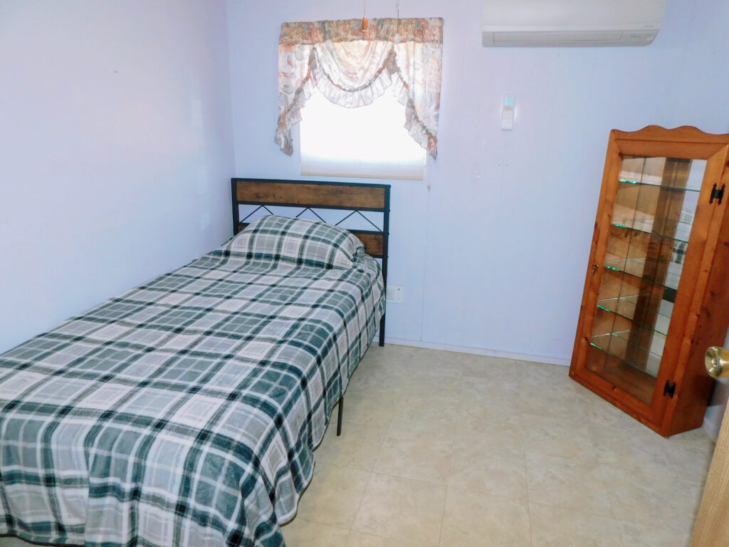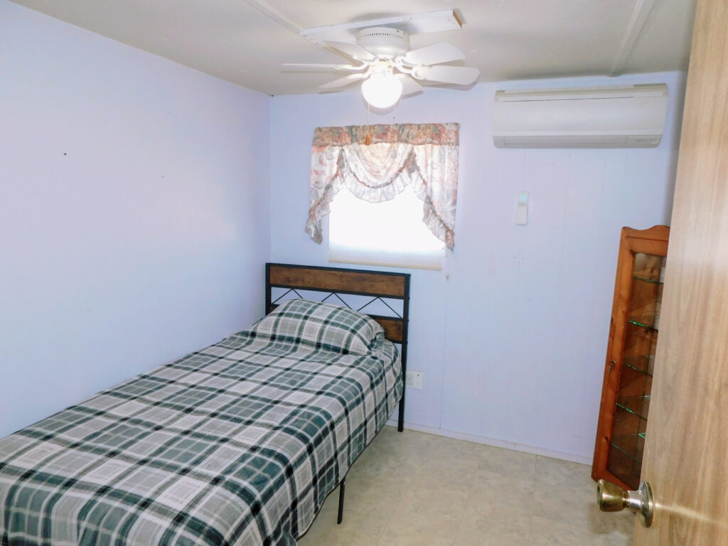 GUEST BEDROOM: Twin bed, lighted ceiling fan, Daikin Mini-Split A/C unit