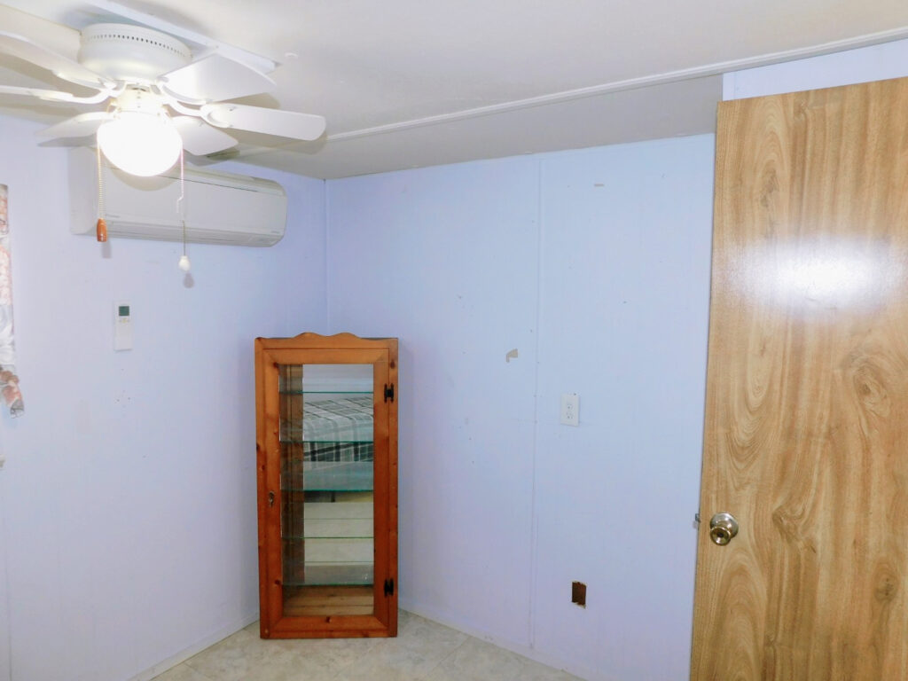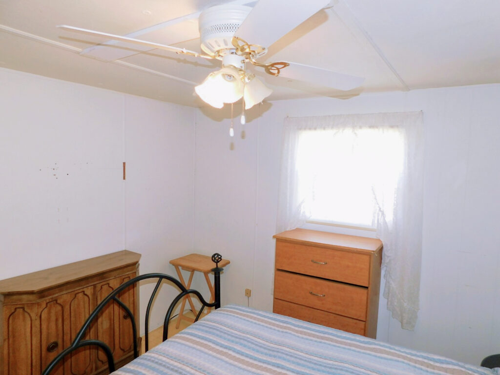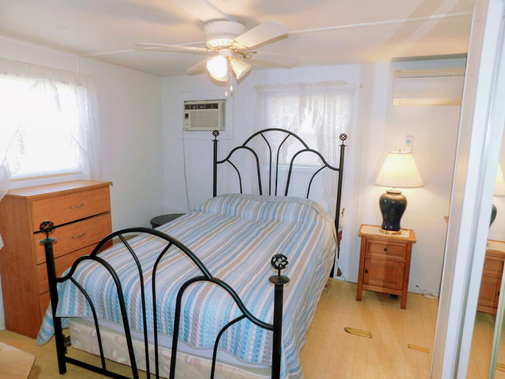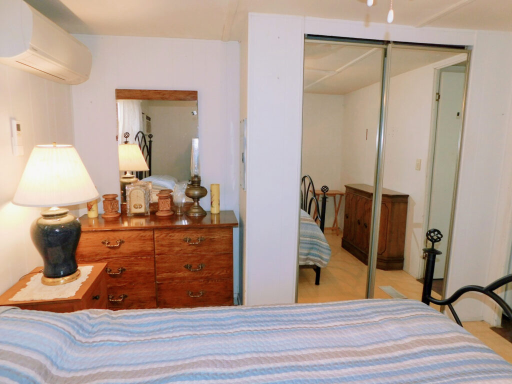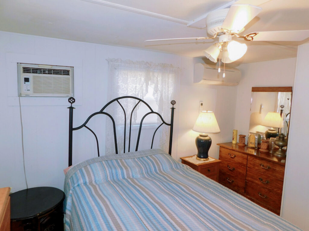 BACK BEDROOM: Full size bed, dresser with mirror, chest of drawers, two nightstands, table lamp, lighted ceiling fan, Daikin Mini-Split A/C unit