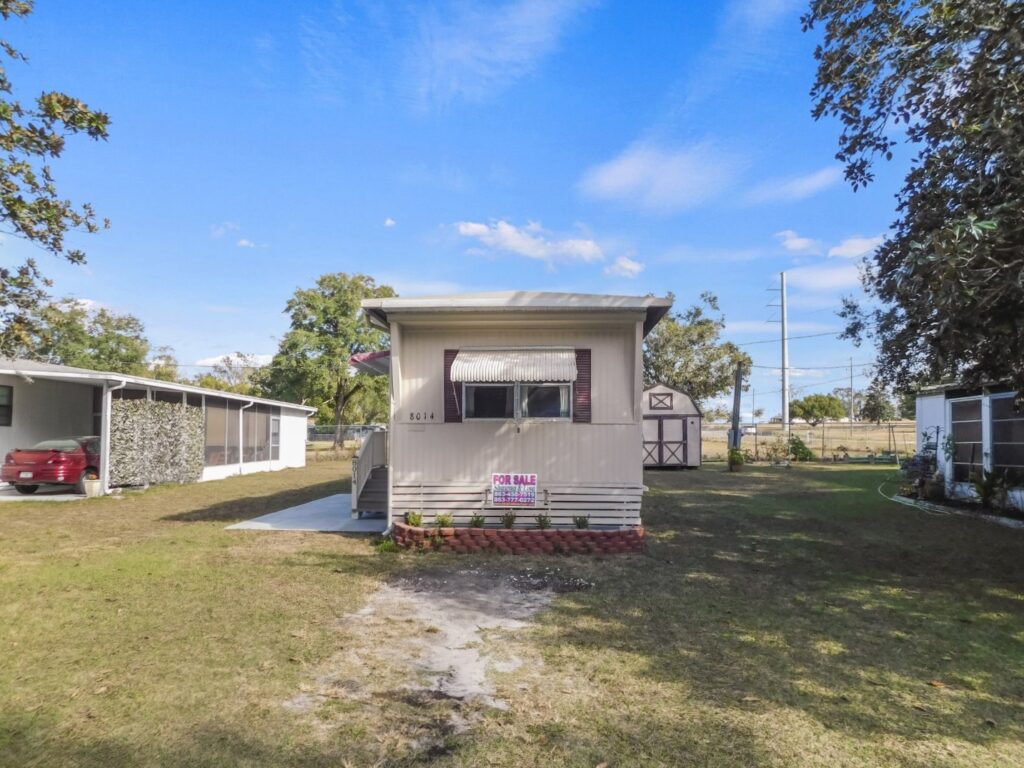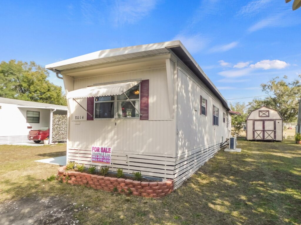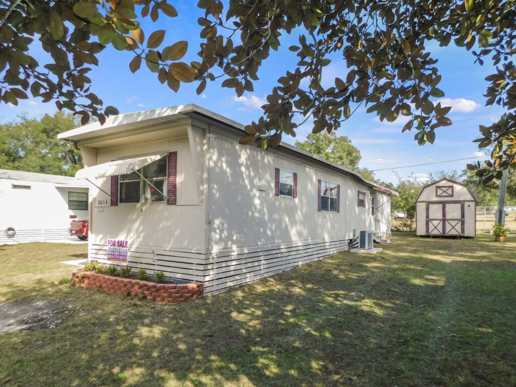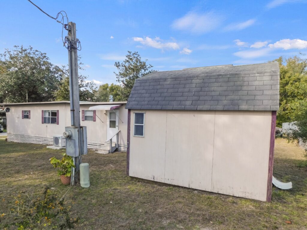 EXTERIOR: Beige metal siding, metal roof, off-street parking for two, 10×12 unattached storage shed