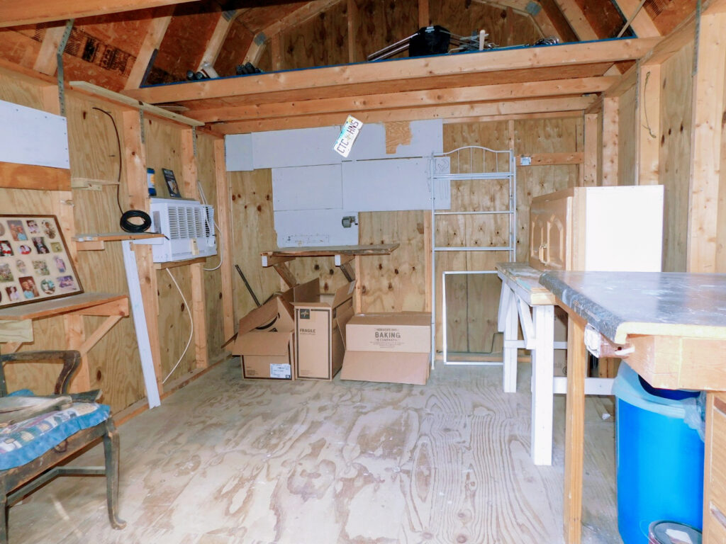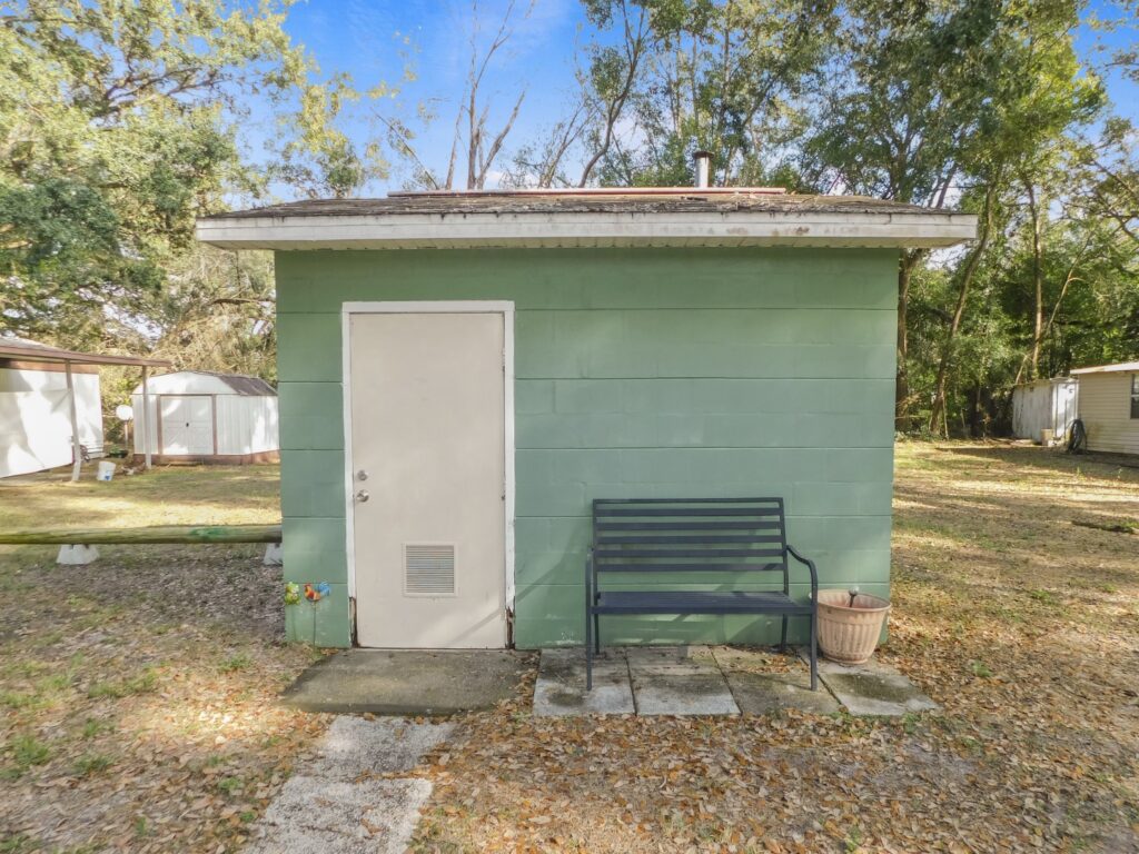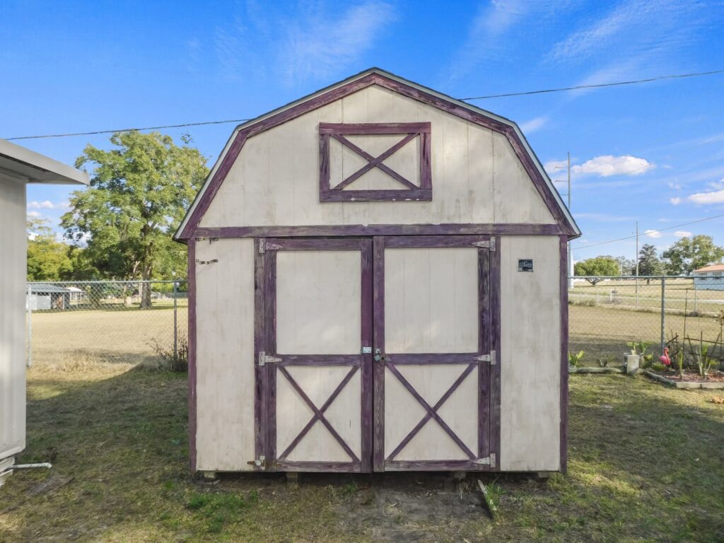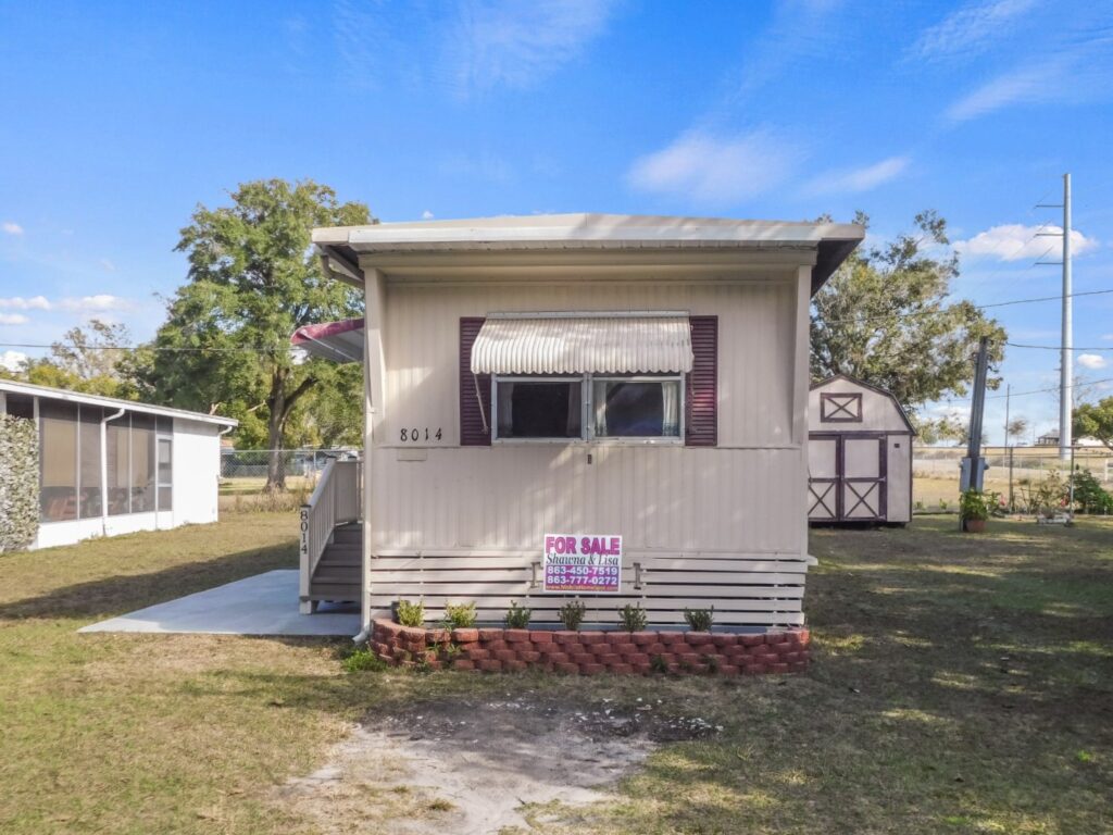 EXTERIOR: Beige metal siding, metal roof, off-street parking for two, 10×12 unattached storage shed