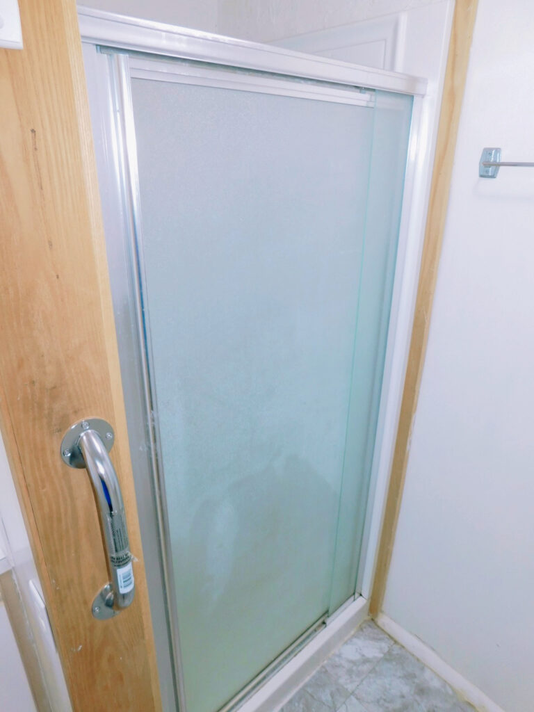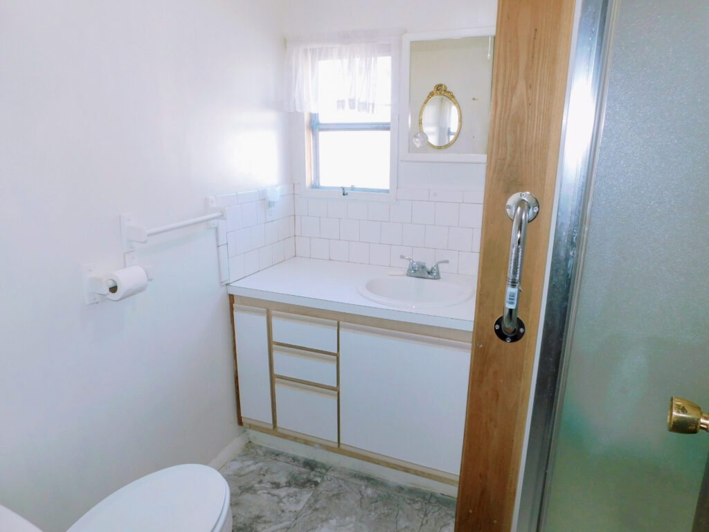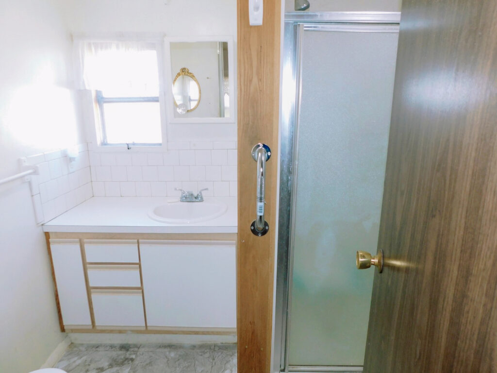 BATHROOM: Walk-in shower, wide single vanity, medicine cabinet, and wall cabinet