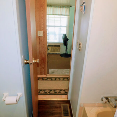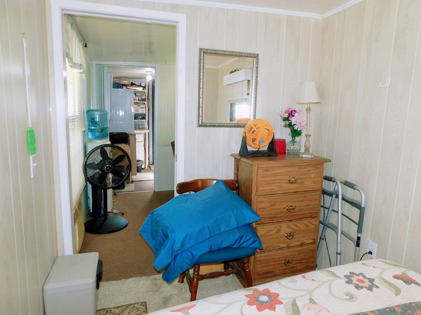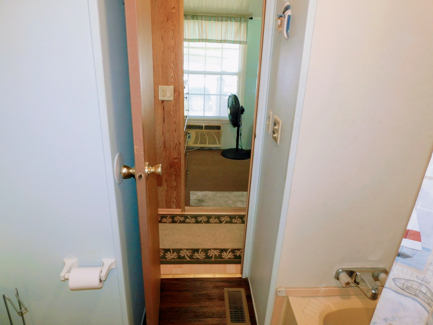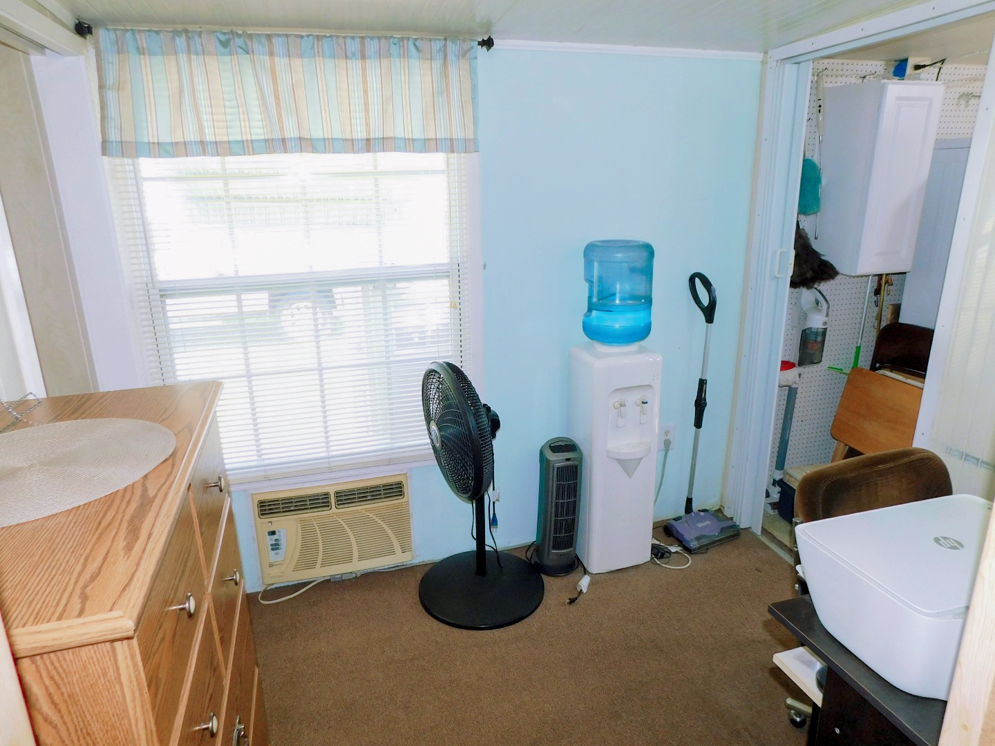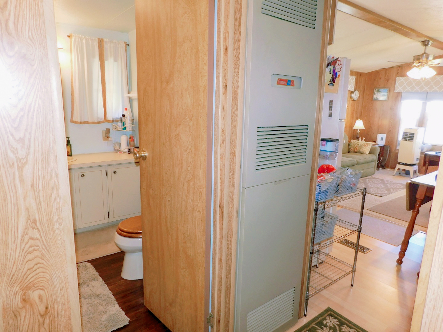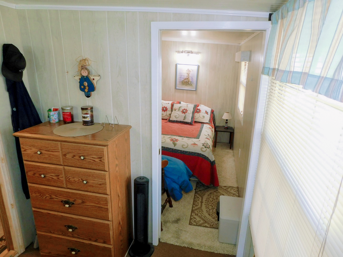 INTERIOR: Portable and window A/C, central gas heat (unusual bonus feature!), two lighted ceiling fans, standard closet and built-in chest of drawers in original bedroom, linen closet in hallway, window treatments throughout