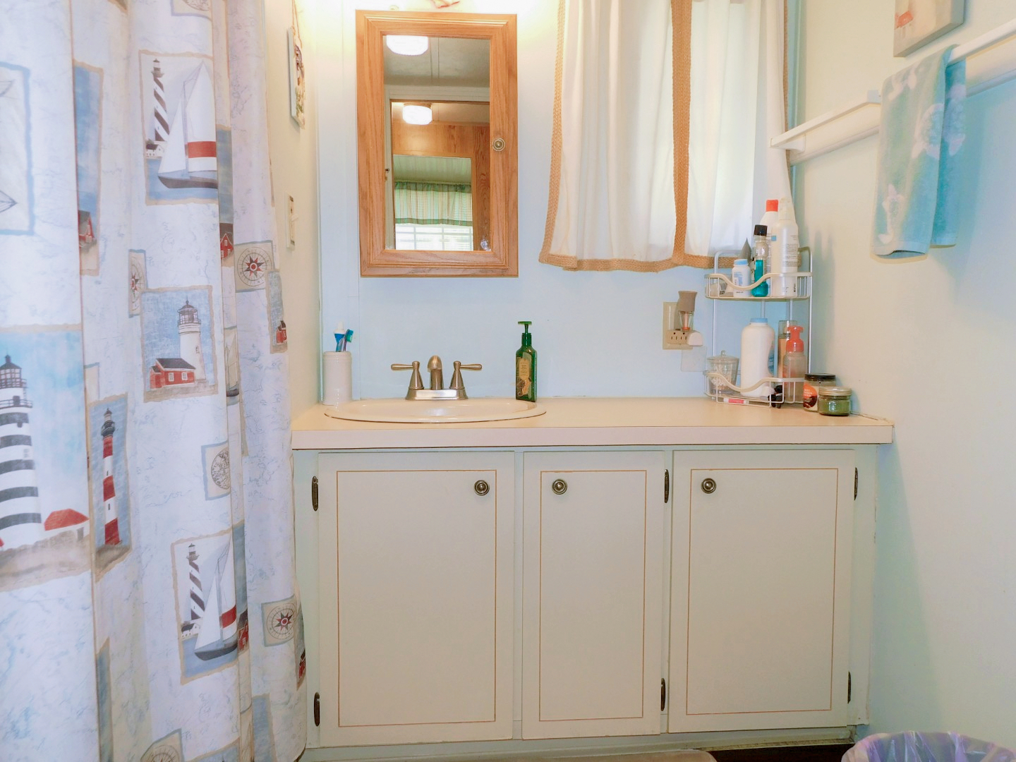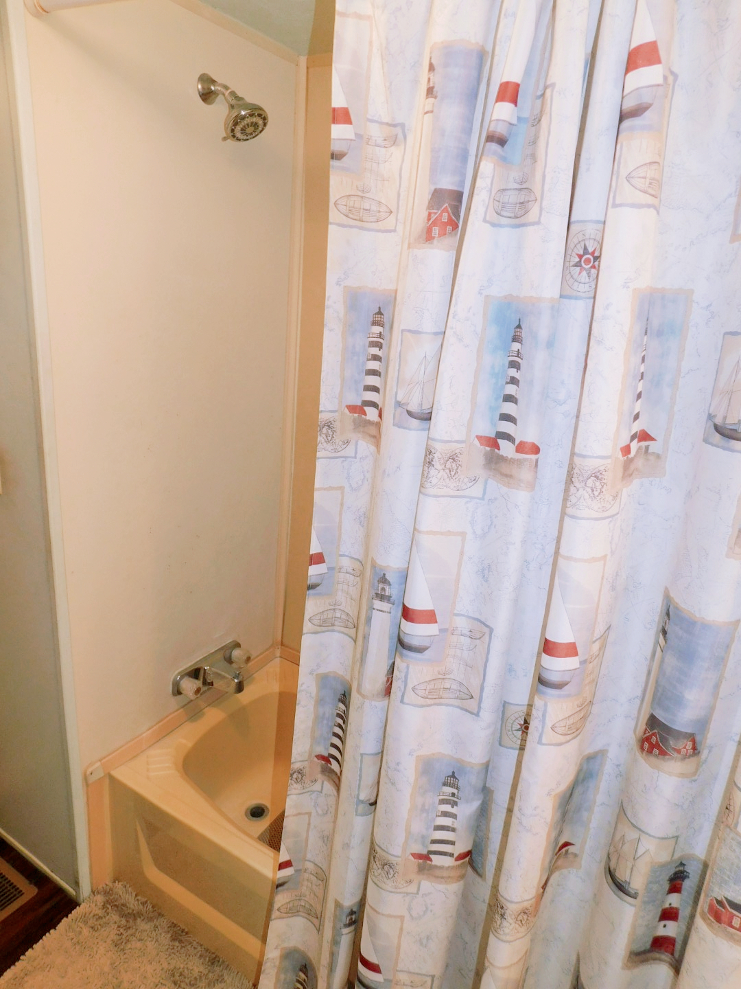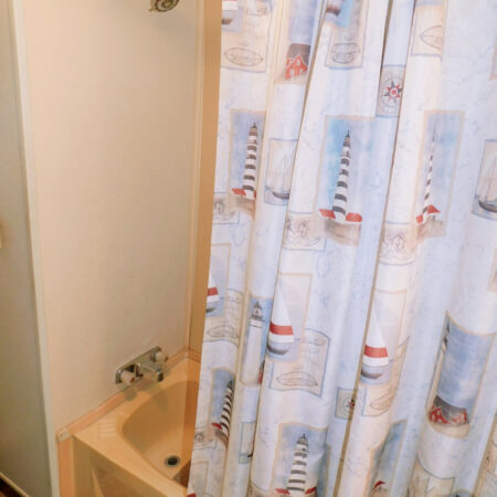 BATHROOM: Combination tub/shower, single vanity, and two medicine cabinets