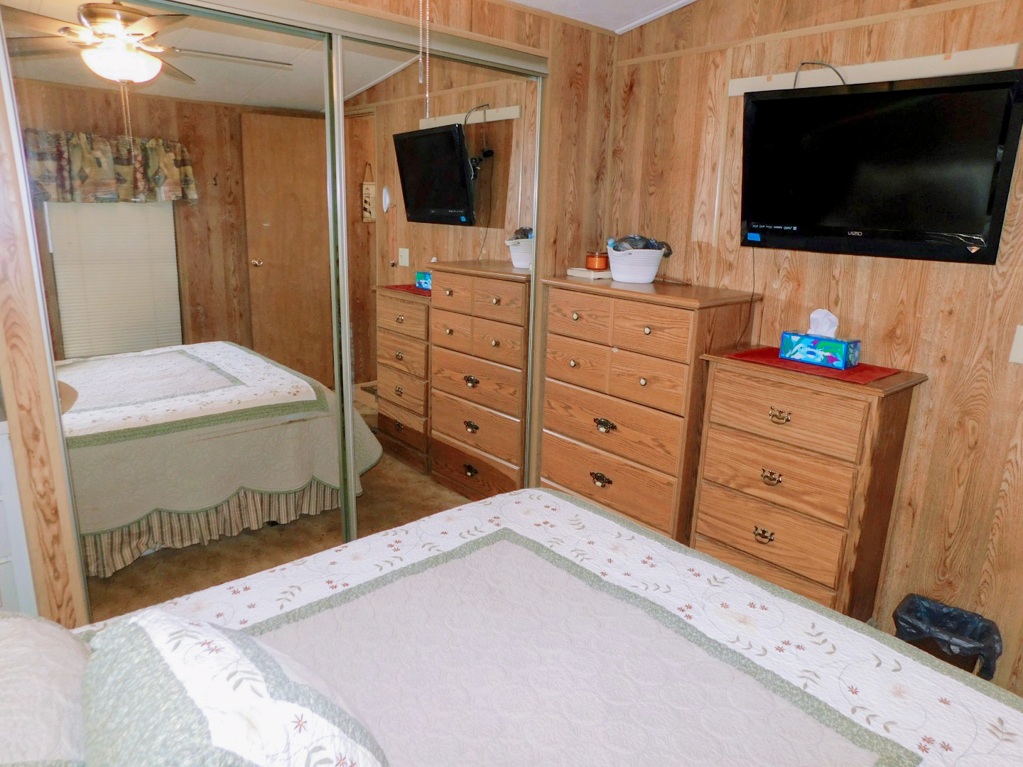 ORIGINAL BEDROOM: Queen bed, two chests of drawers, lighted ceiling fan