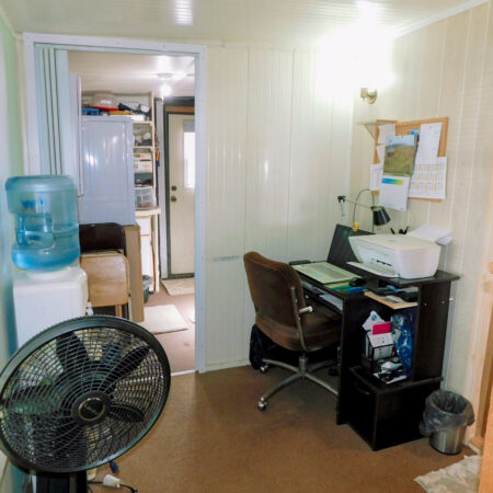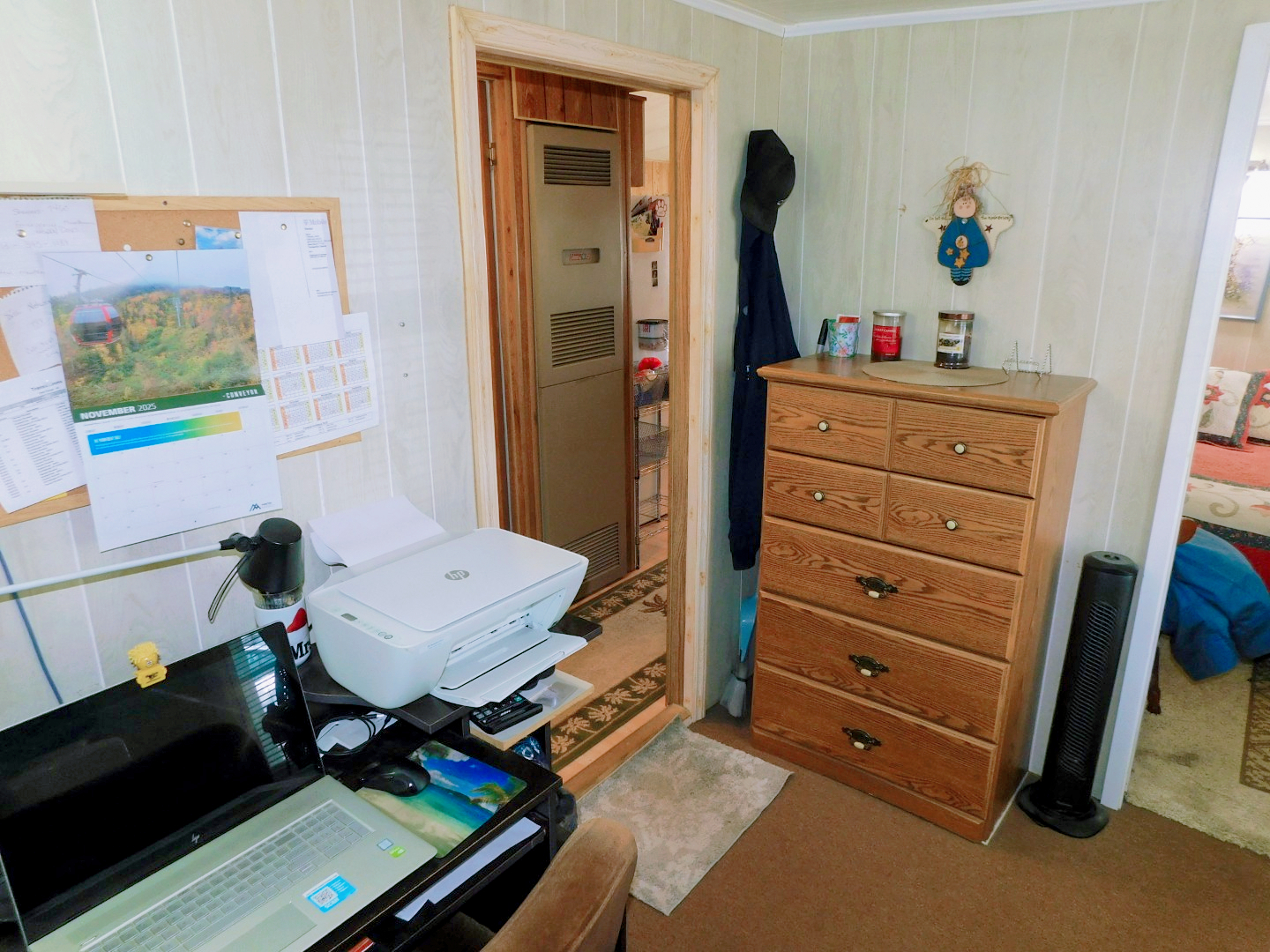HOME OFFICE: Desk, chair, chest of drawers, wall A/C unit