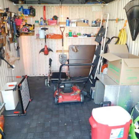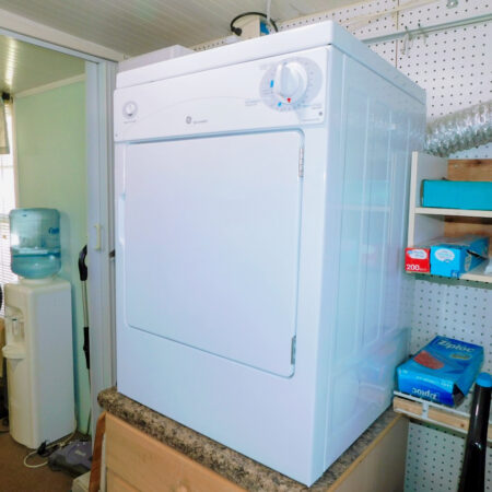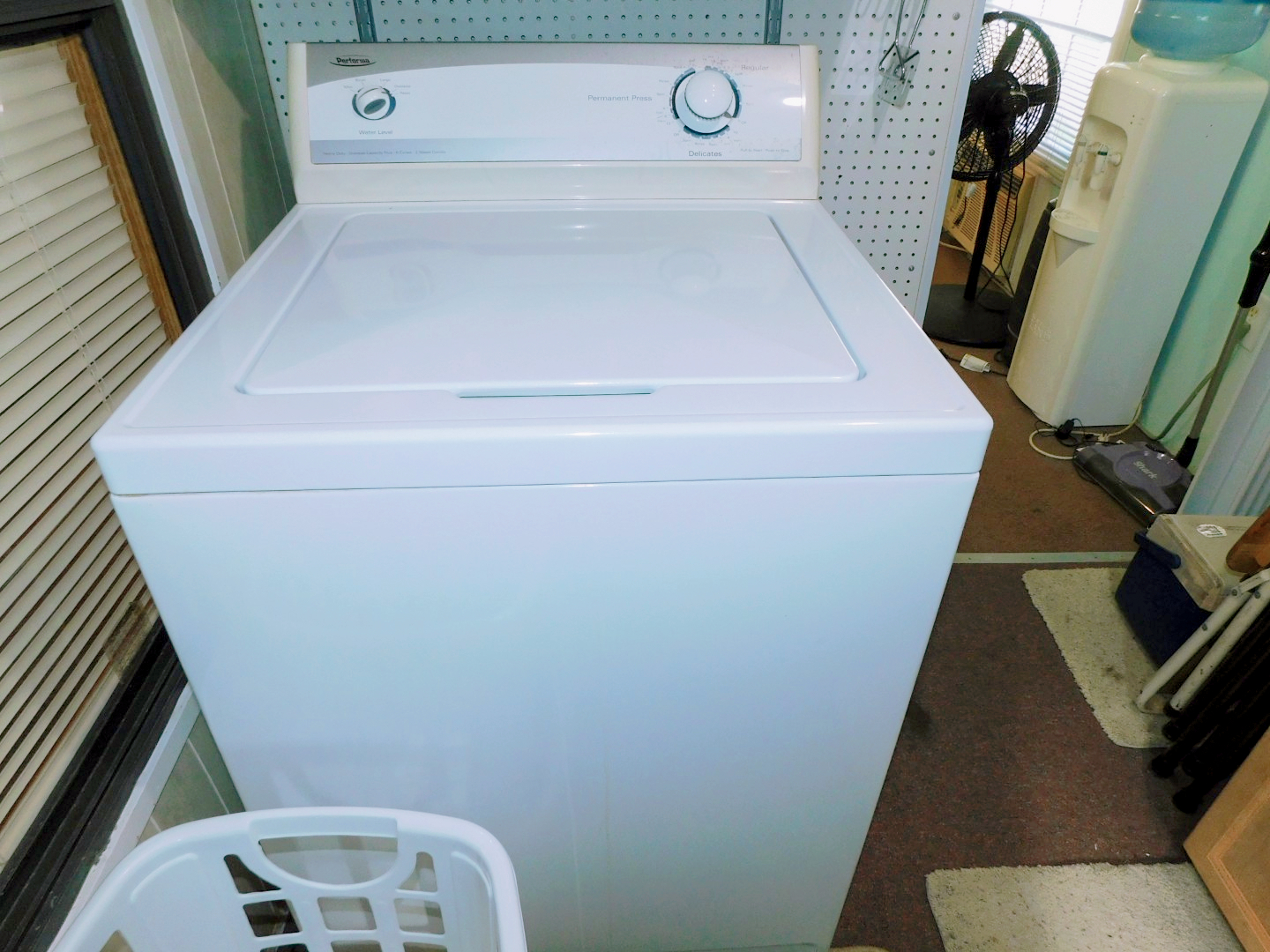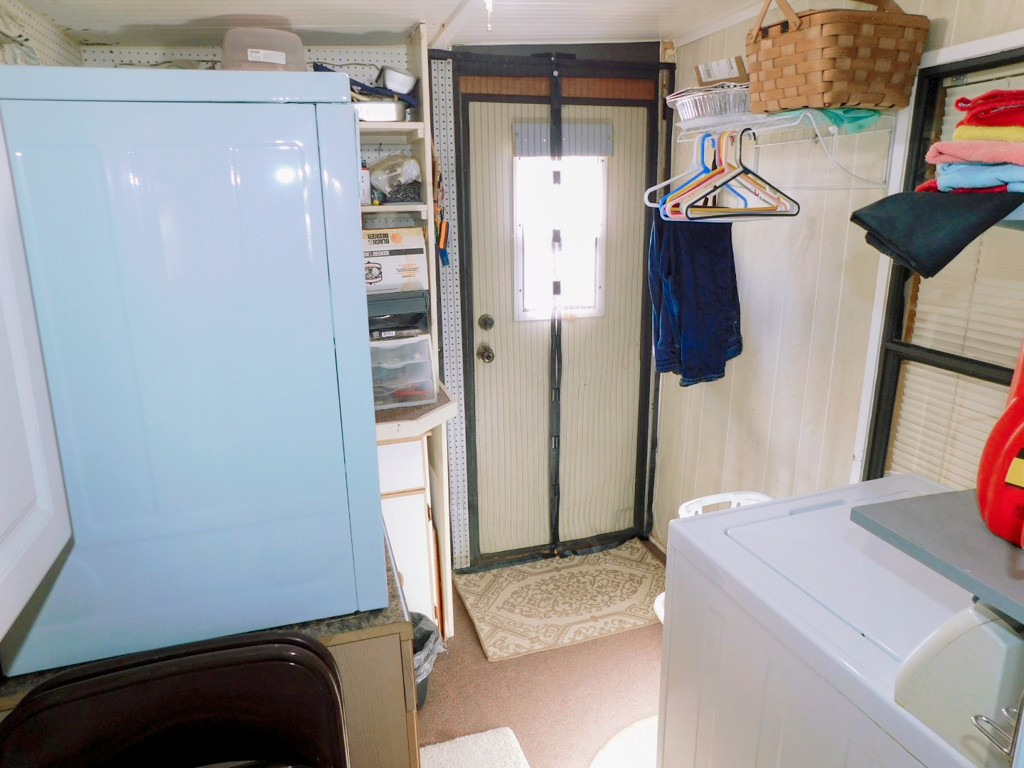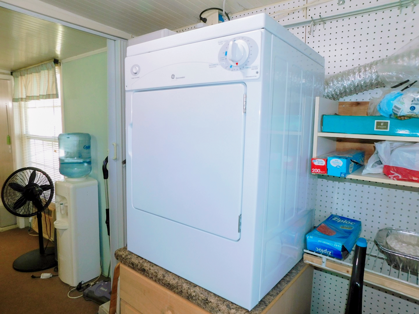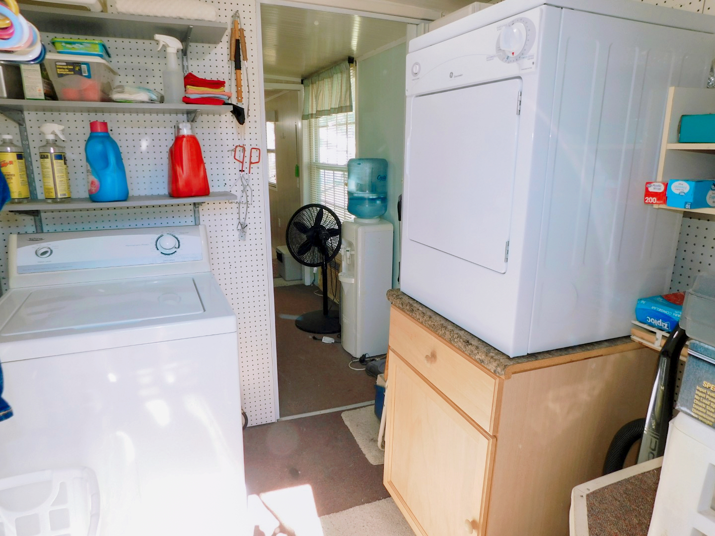 LAUNDRY/STORAGE ROOM: Performa (Maytag) washer, GE dryer, work bench, shelving
