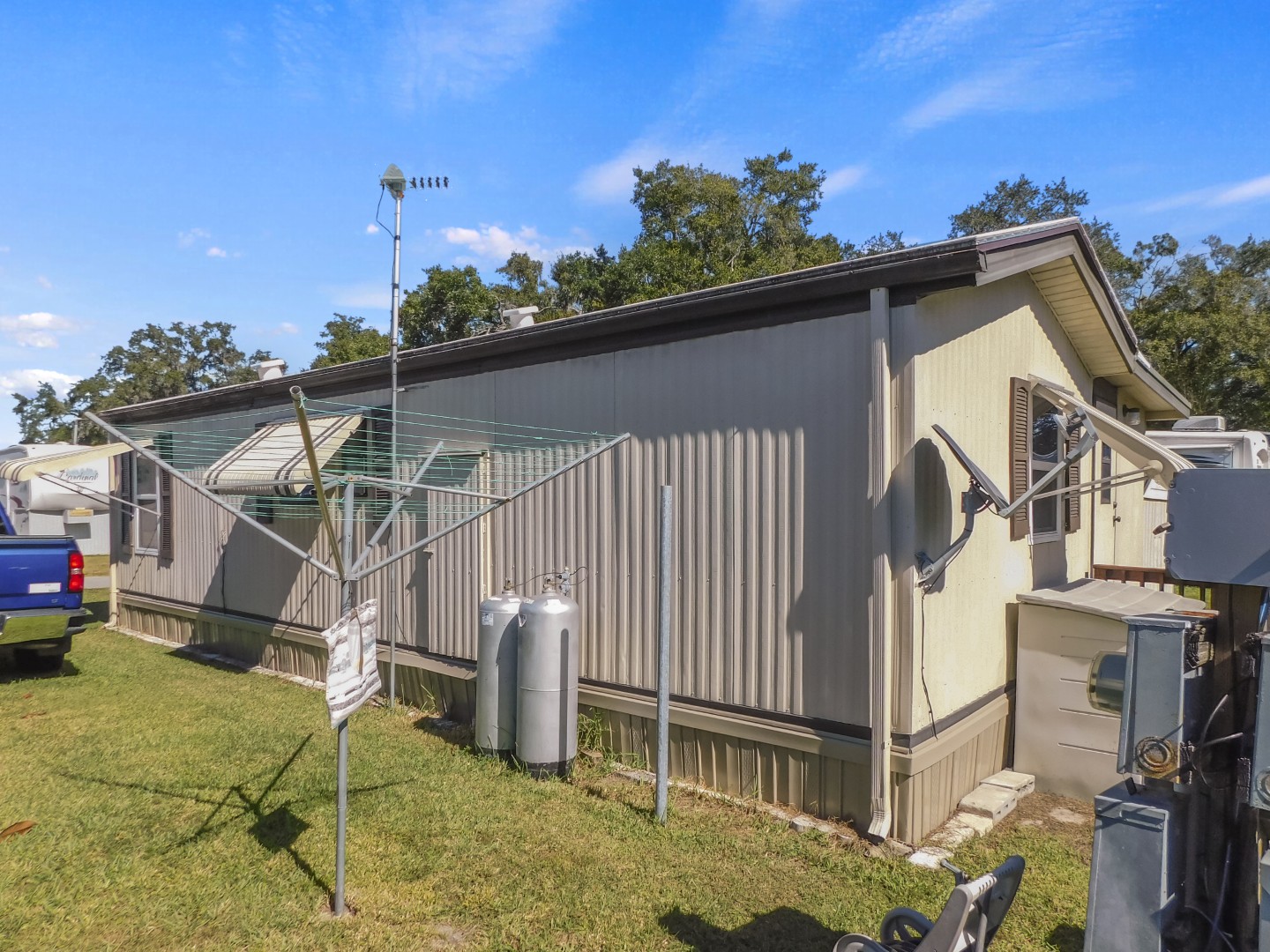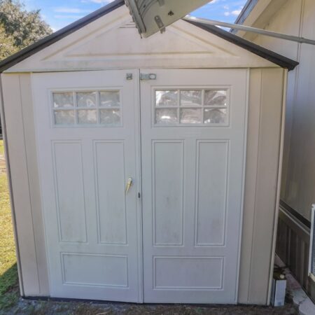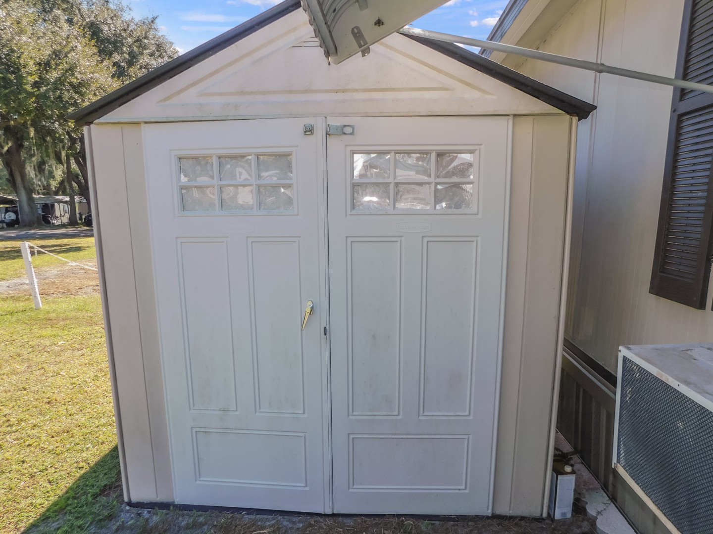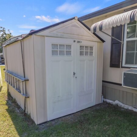 EXTERIOR: Recently painted ivory metal siding and brown trim, newer skirting, newer (2023) TPO-rubber roof-over, 7×9 covered front porch, 7×10 unattached storage shed with double doors, off-street parking for two, lot location on quiet no-outlet street