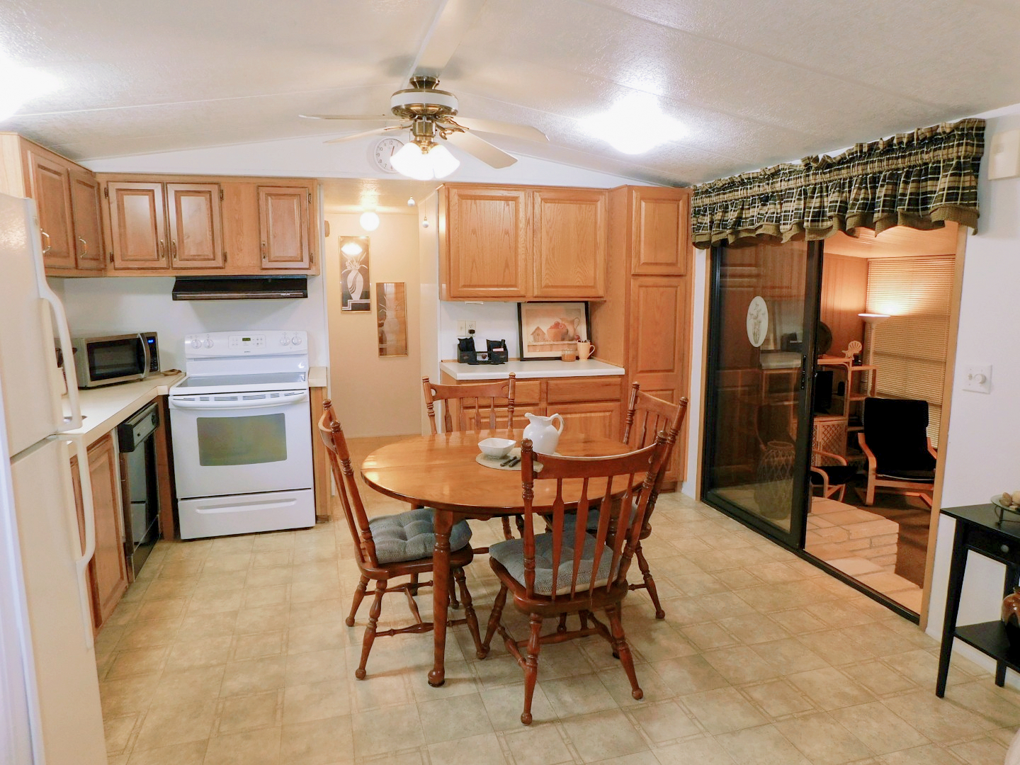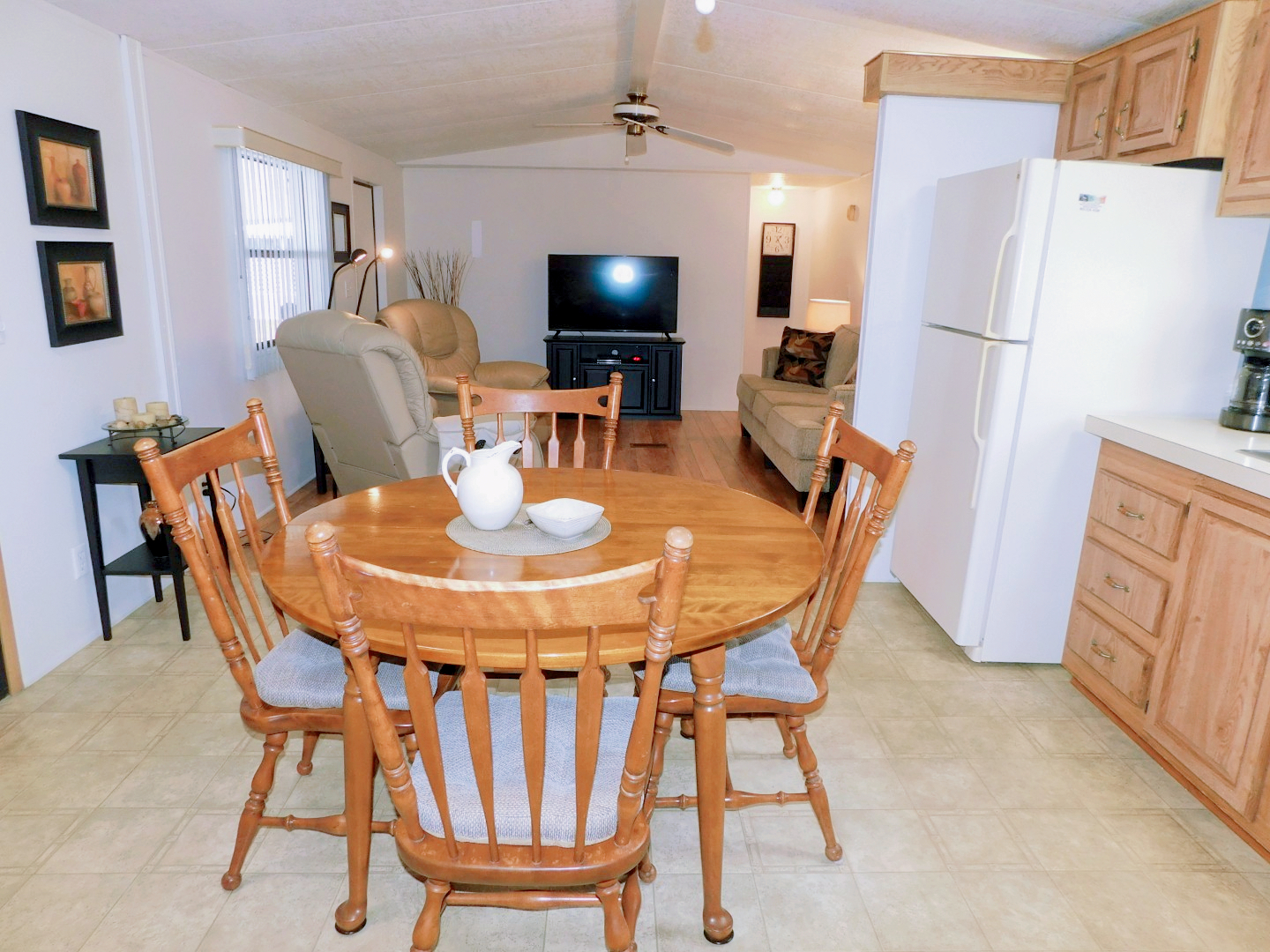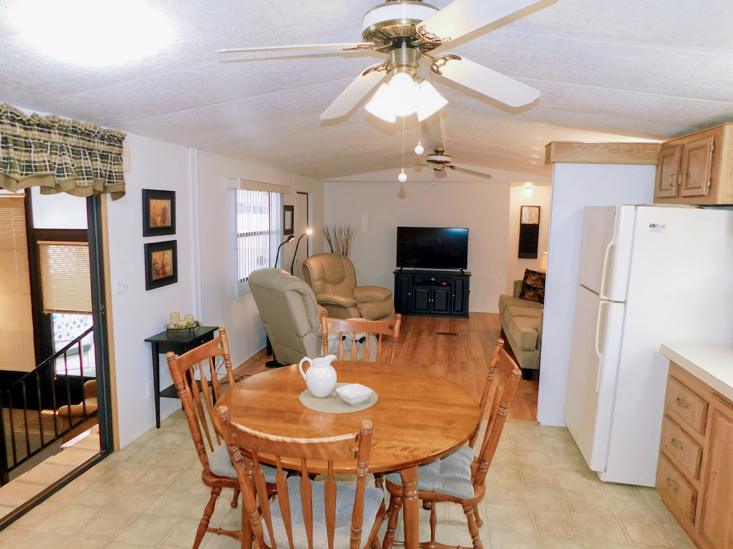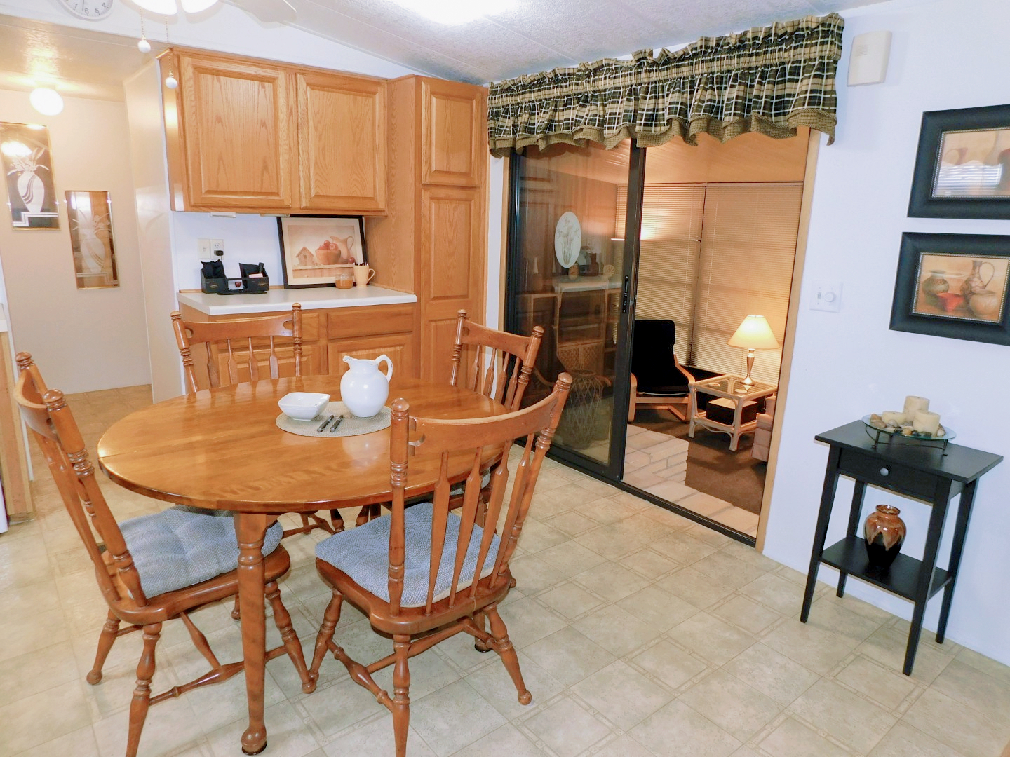 DINING AREA: Table, four chairs, end table, lighted ceiling fan