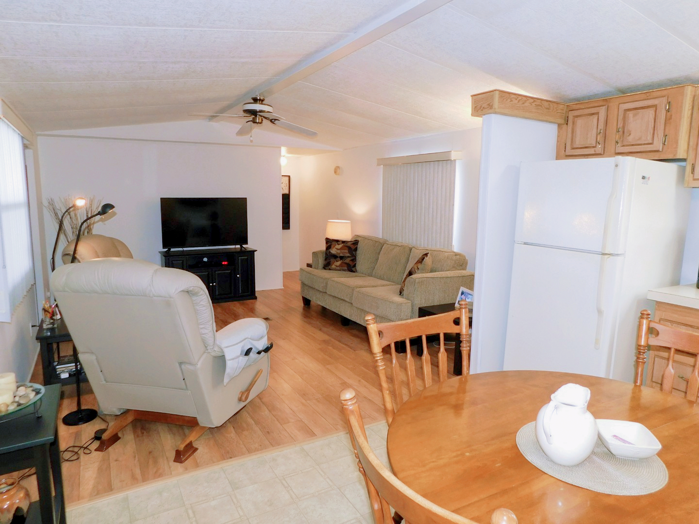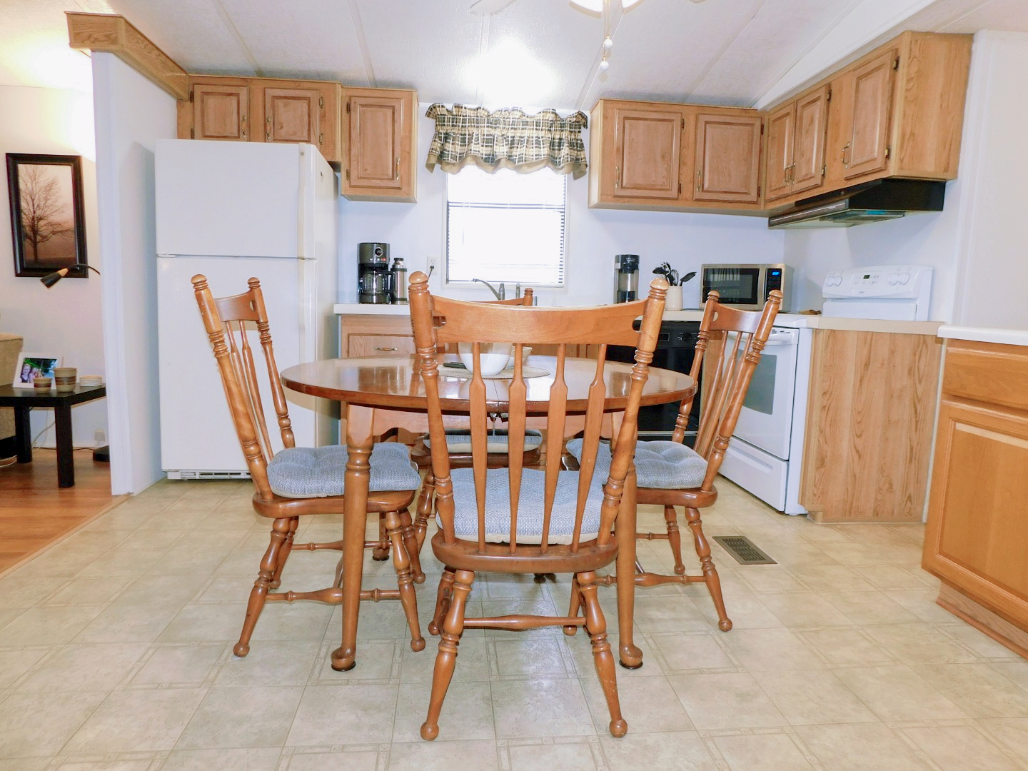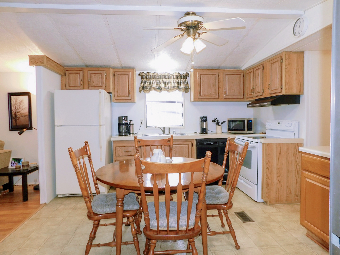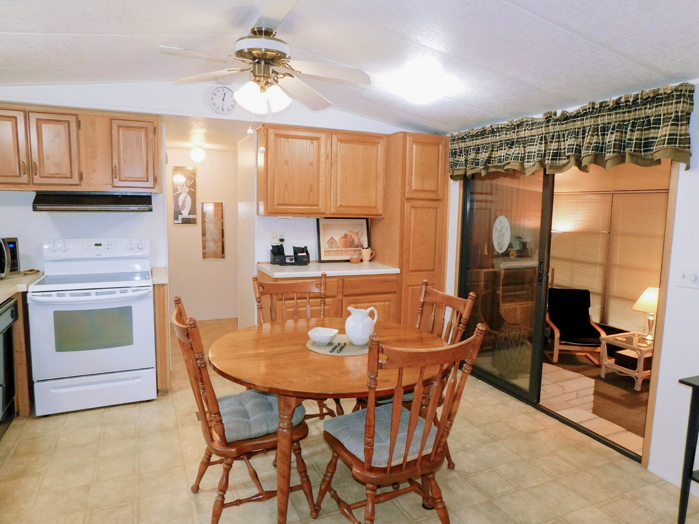 DINING AREA: Table, four chairs, end table, lighted ceiling fan