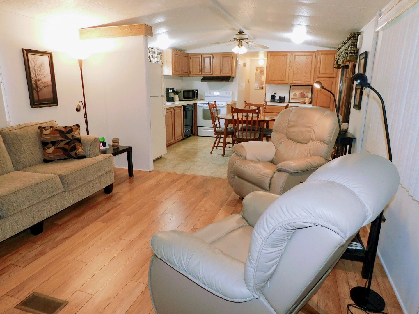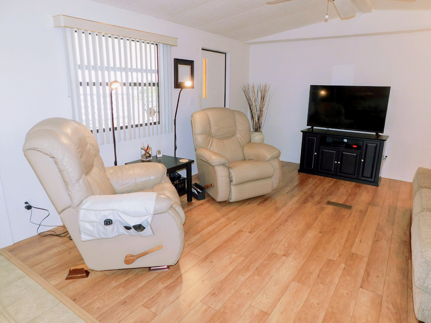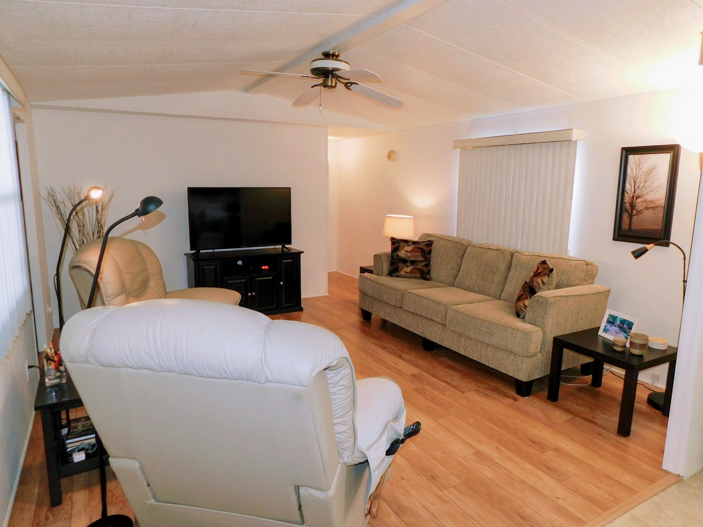 LIVING ROOM: Sofa, two recliners, three end tables, table lamp, three floor lamps, TV and stand, ceiling fan