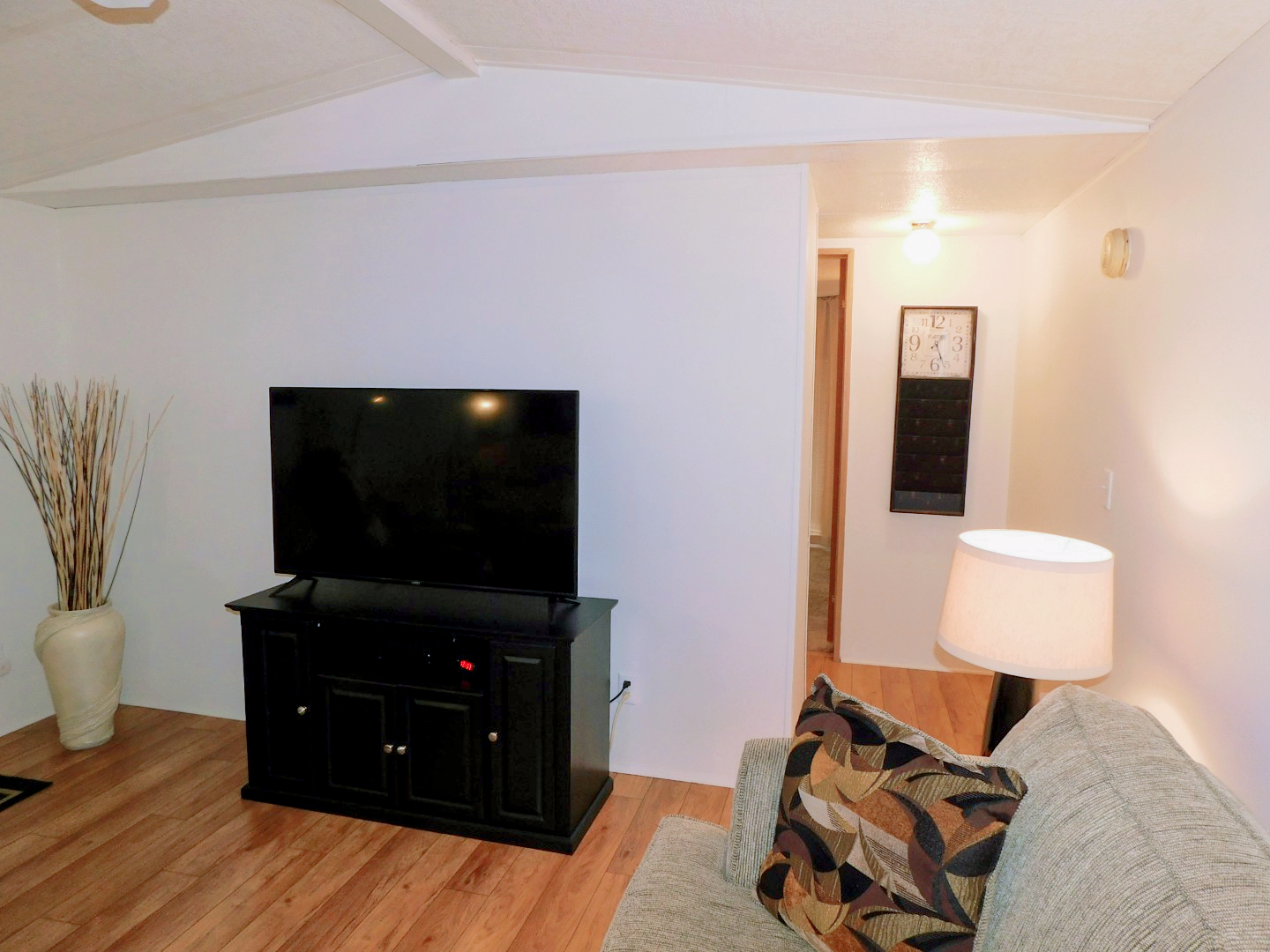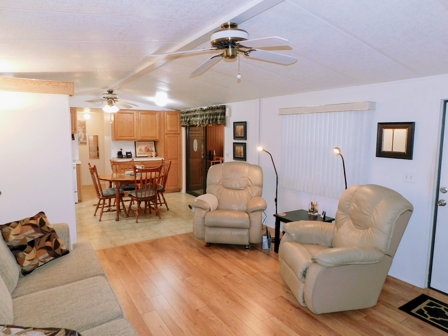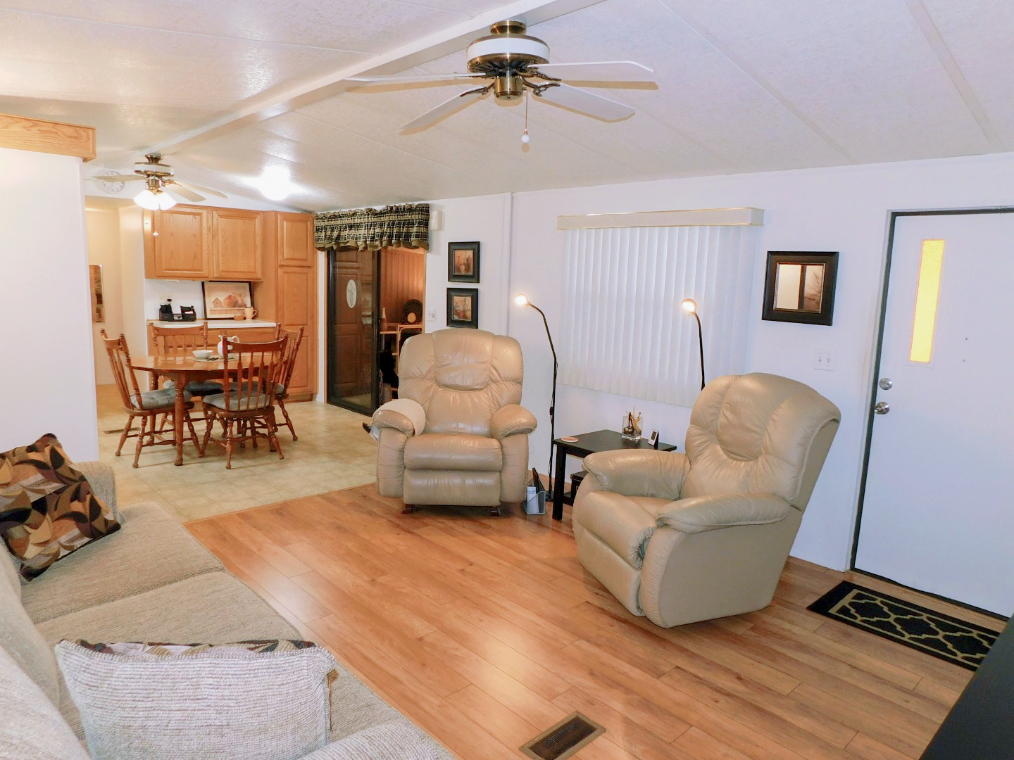 LIVING ROOM: Sofa, two recliners, three end tables, table lamp, three floor lamps, TV and stand, ceiling fan