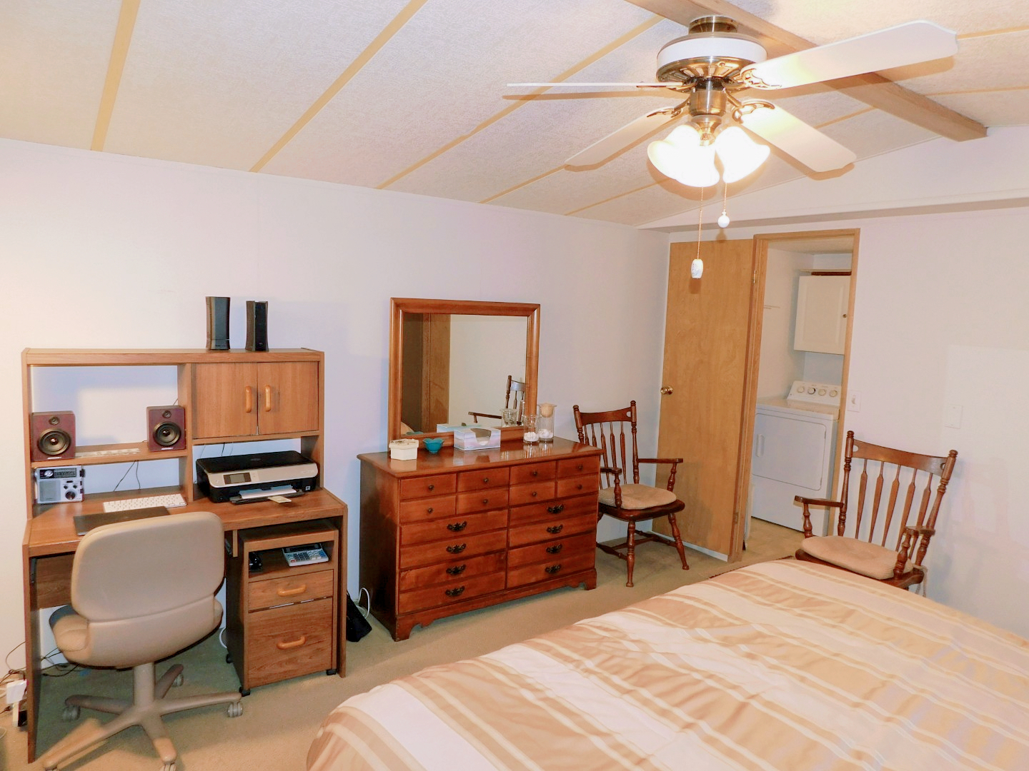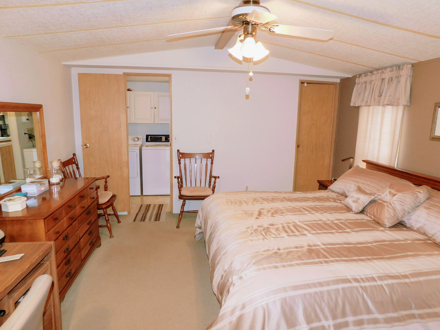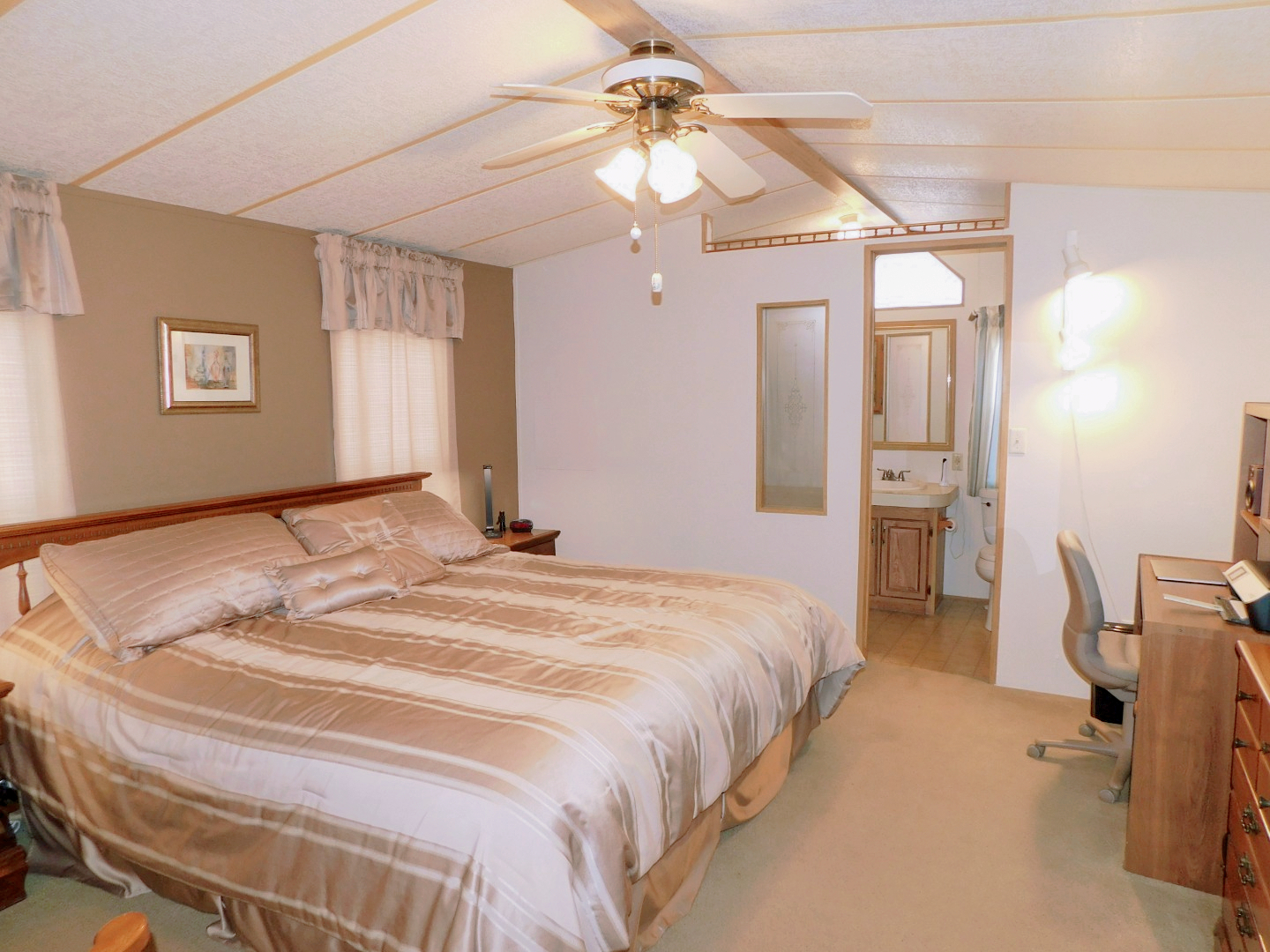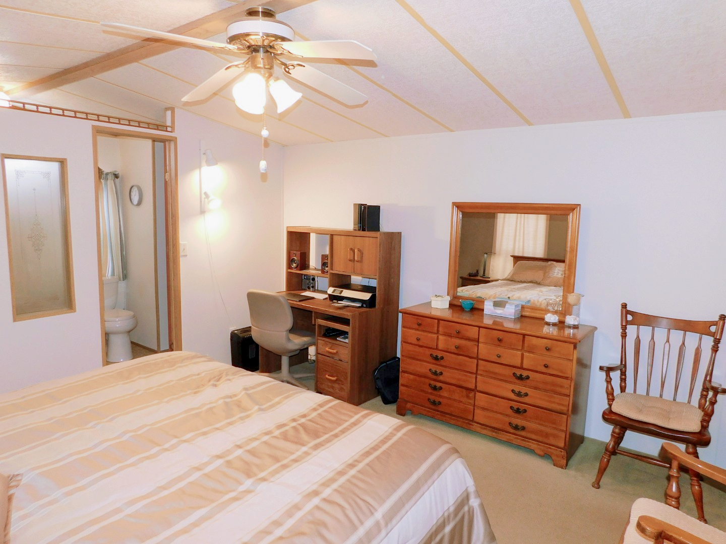MASTER BEDROOM: King bed, three chairs, dresser with mirror, two nightstands, desk, two table lamps, lighted ceiling fan