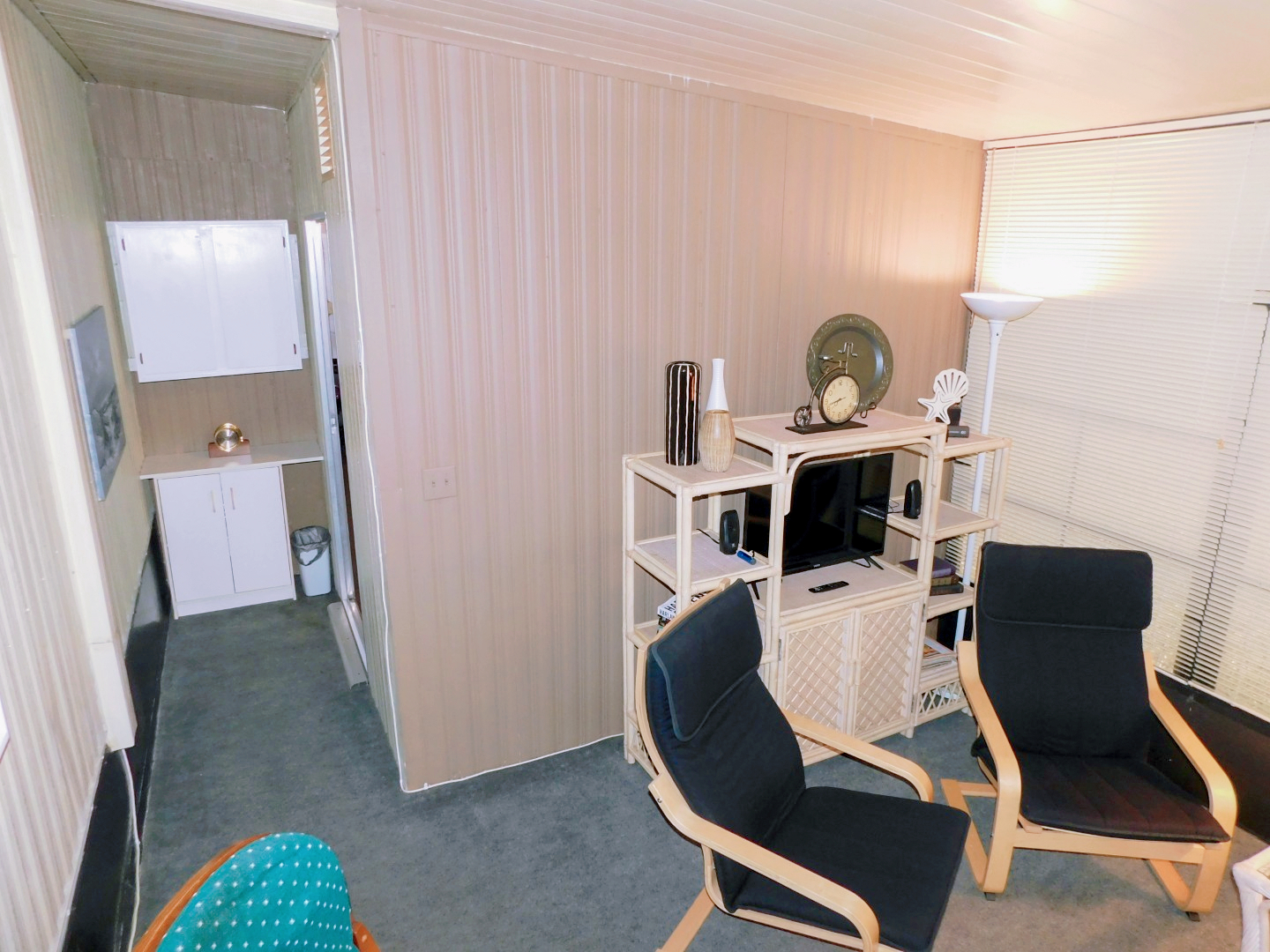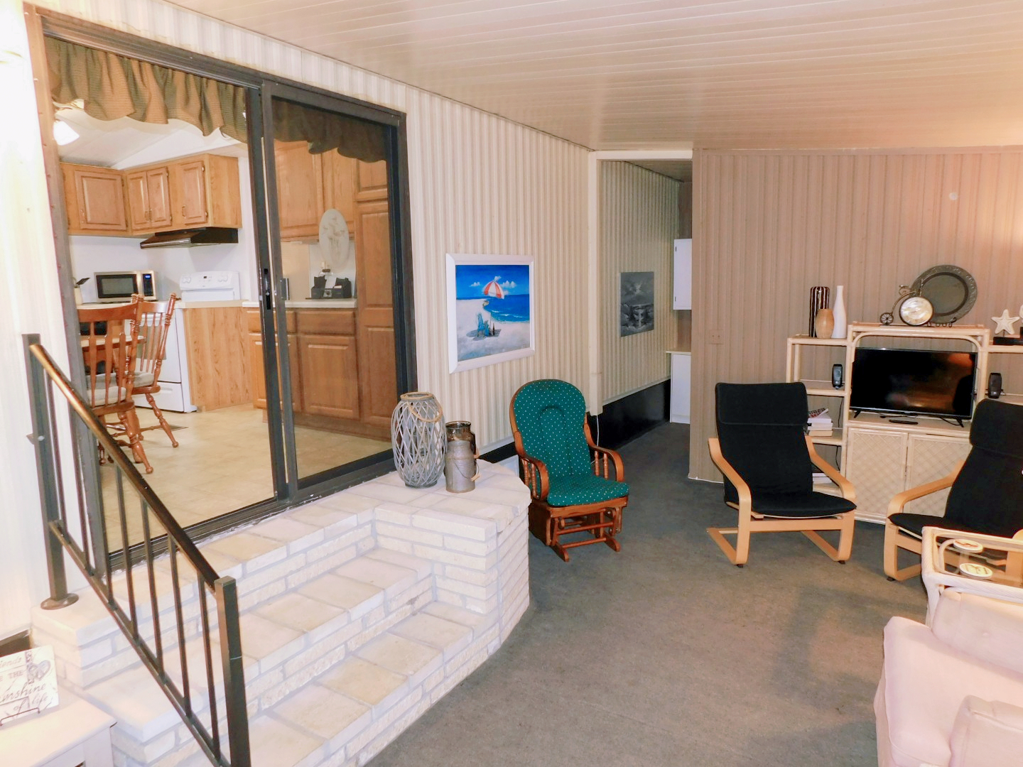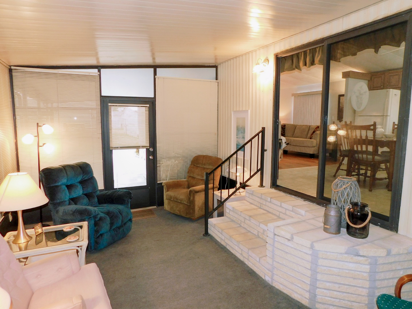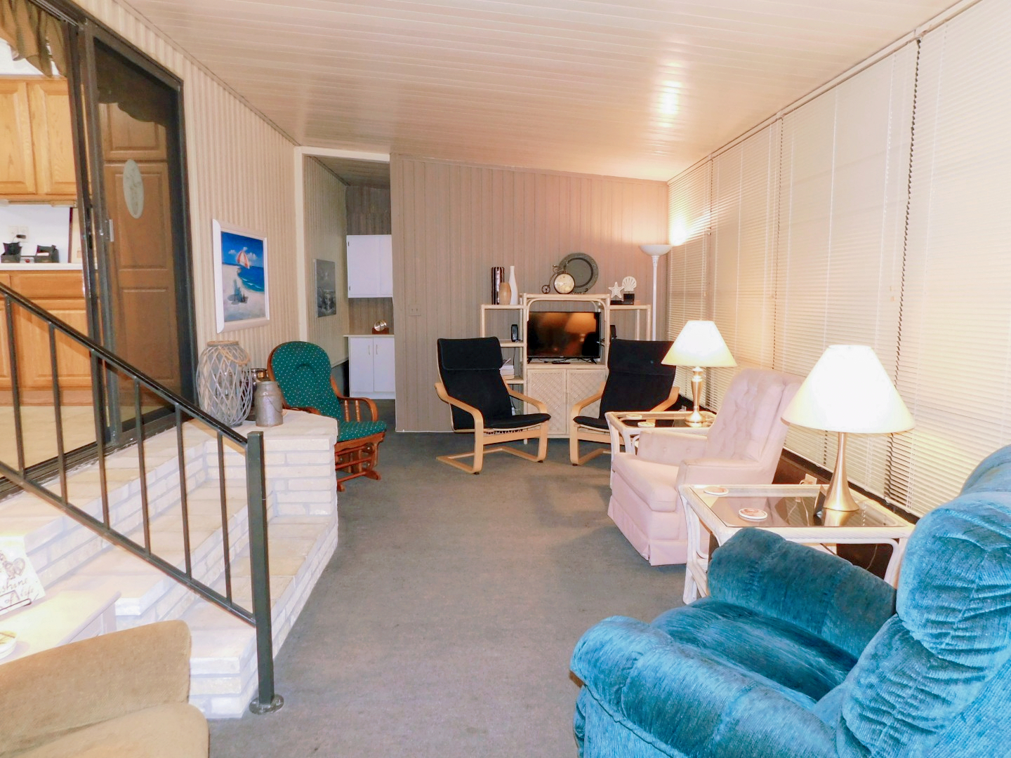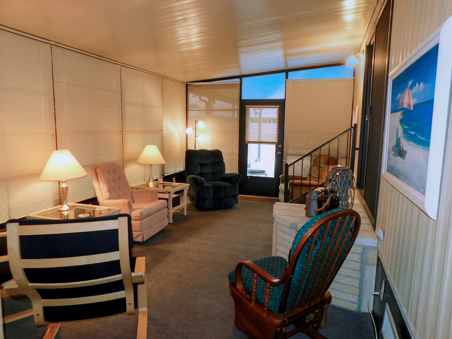 FLORIDA ROOM: Two recliners, three chairs, rocker, three end tables, three table lamps, two floor lamps, TV and stand