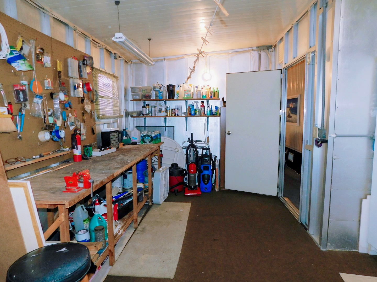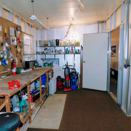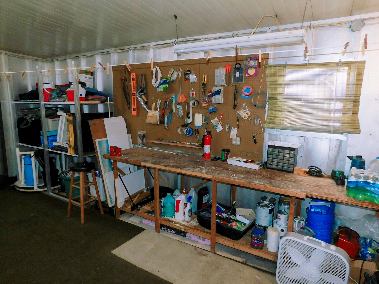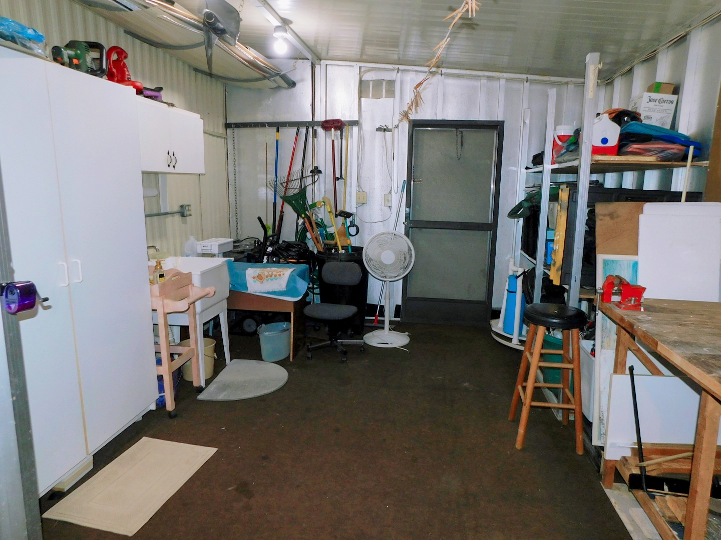 STORAGE SHED: Work bench, shelving, laundry sink
