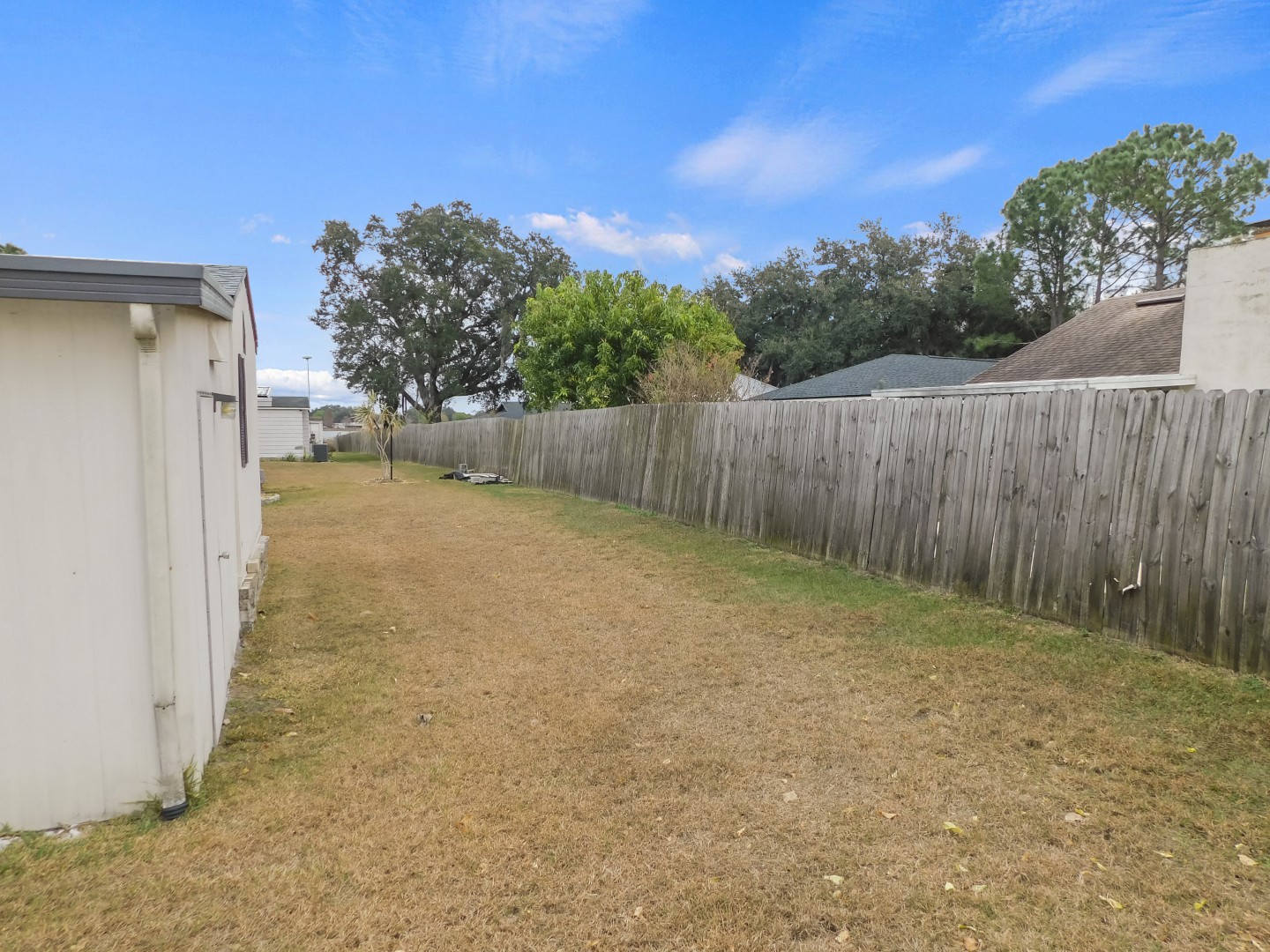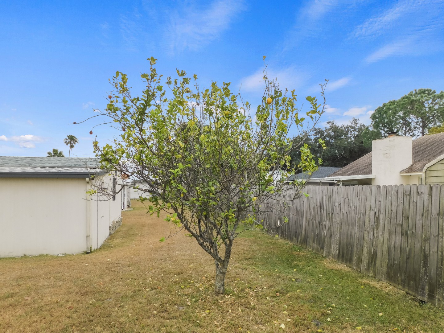 EXTERIOR: Ivory metal siding with brown trim, asphalt shingle roof (2018), carport, 9×20 attached storage shed accessible from Florida room, border lot with semi-private back yard