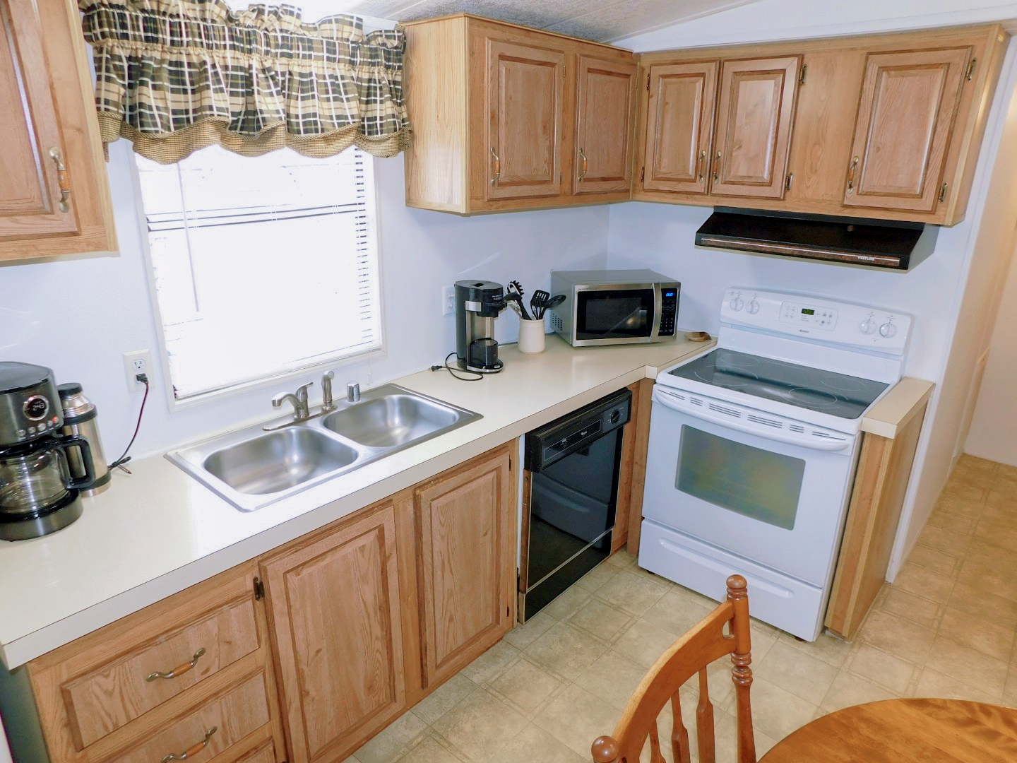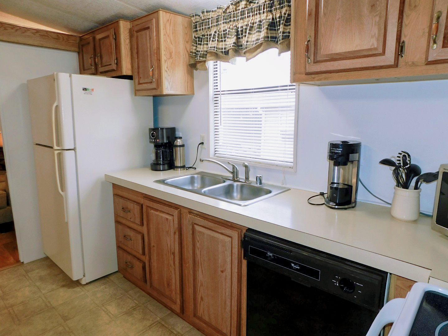 KITCHEN: GE refrigerator, Kenmore range, Whirlpool dishwasher, Sharp microwave, pots and pans, dishware, silverware, utensils