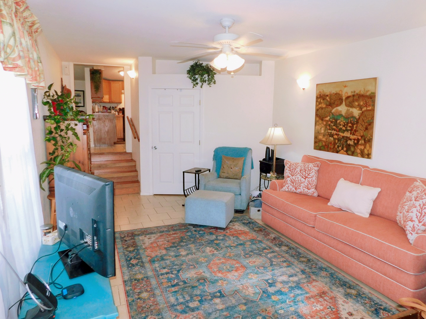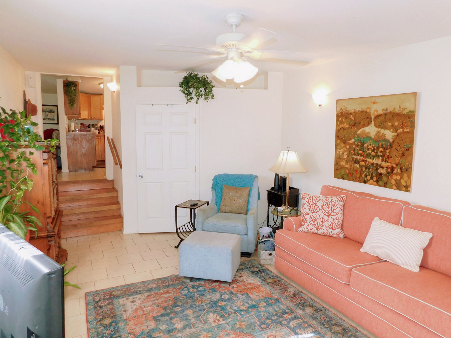 BONUS ROOM ADDITION: Sofa, chair and ottoman, hutch, two occasional tables, corner table, table lamp, TV and stand, lighted ceiling fan