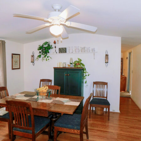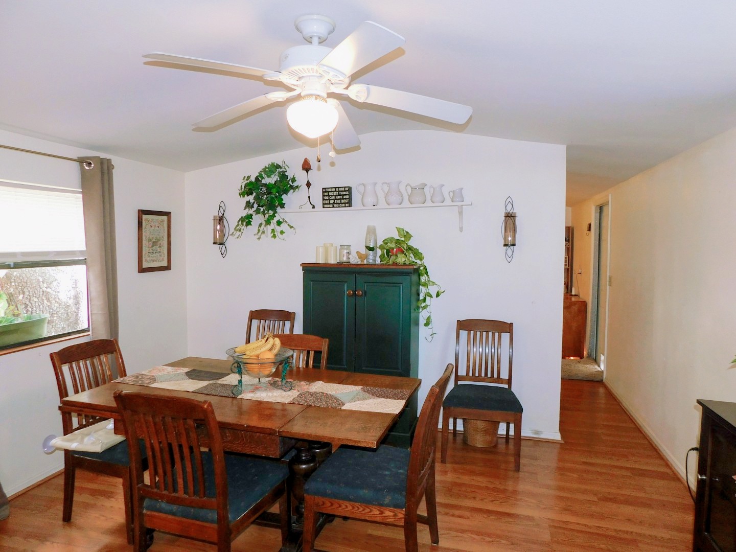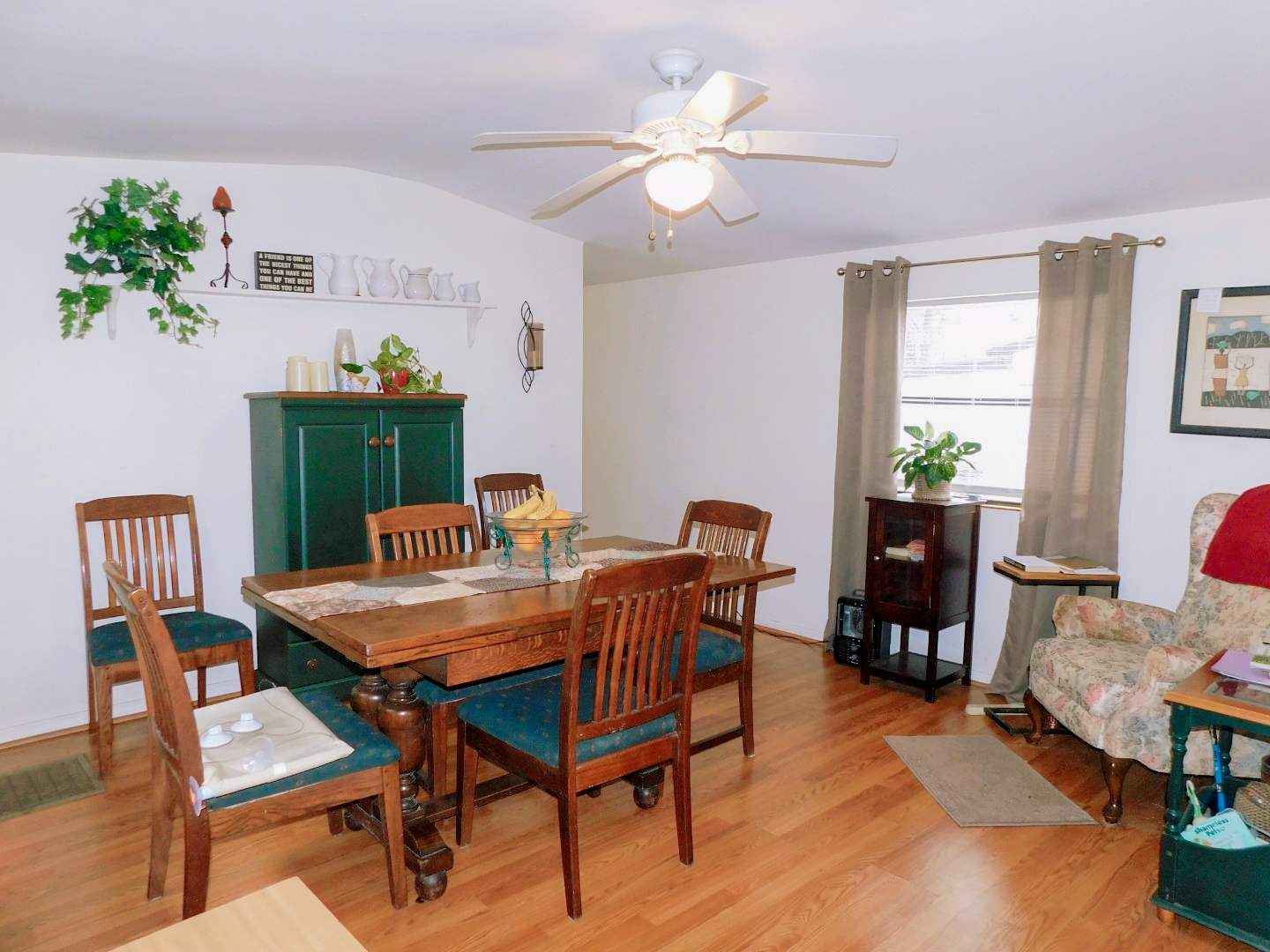 LIVING ROOM: Table, six chairs, recliner, two end tables, TV, TV cabinet, lighted ceiling fan