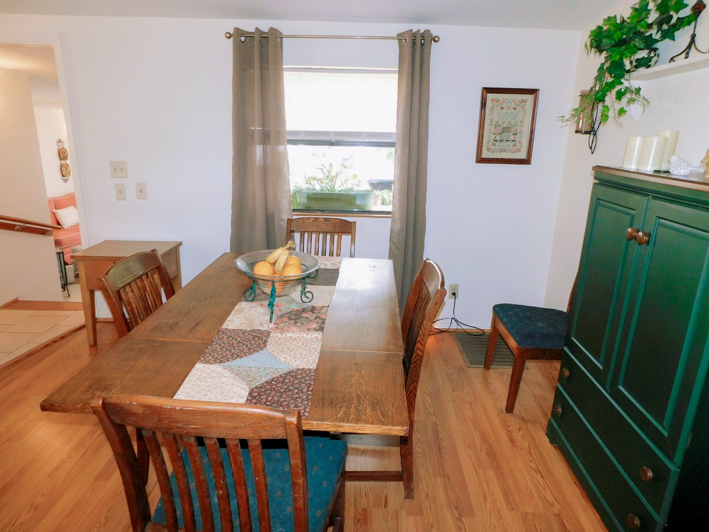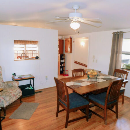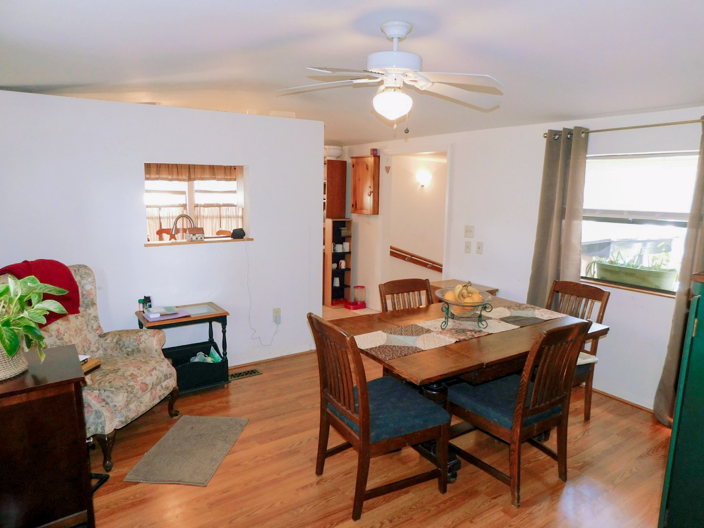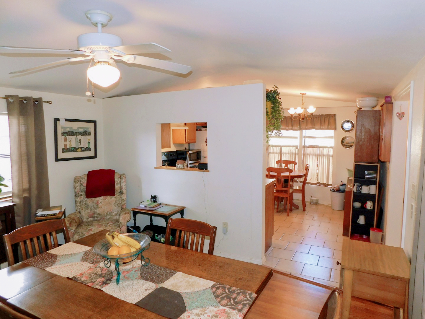 LIVING ROOM: Table, six chairs, recliner, two end tables, TV, TV cabinet, lighted ceiling fan