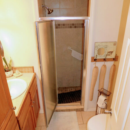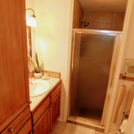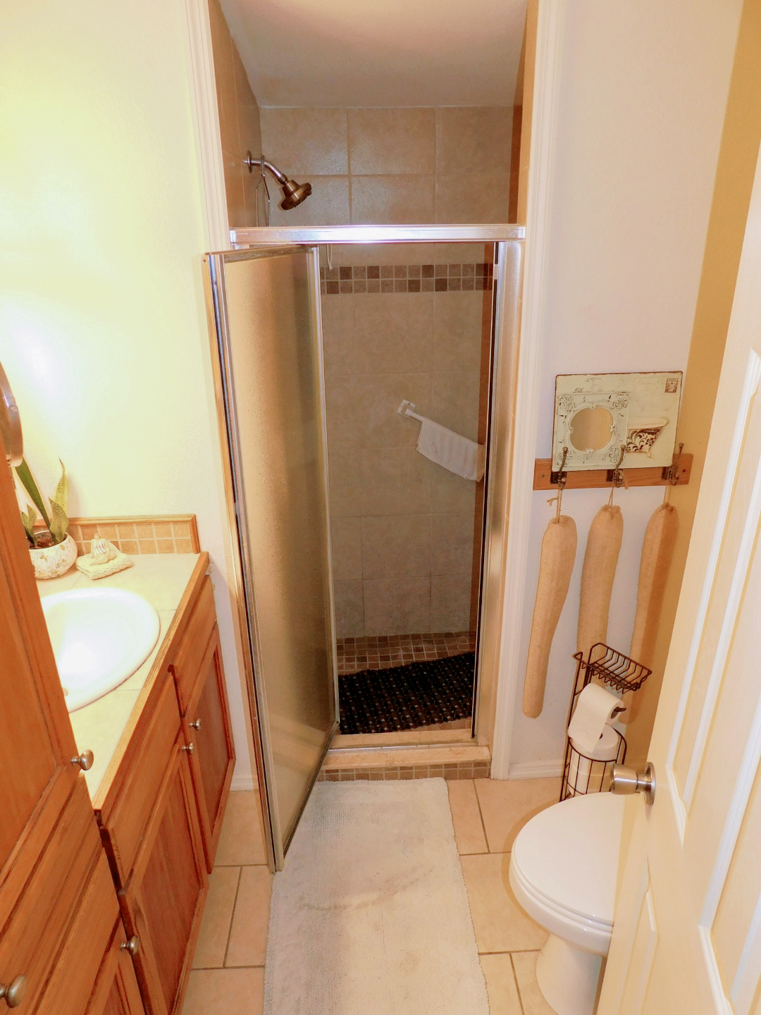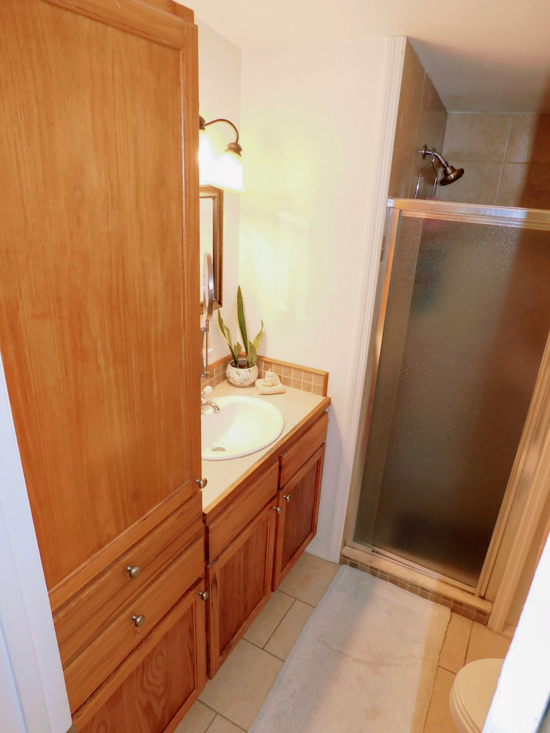 UPDATED BATHROOM: Walk-in shower, single vanity, and tall linen cabinet