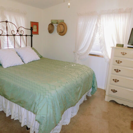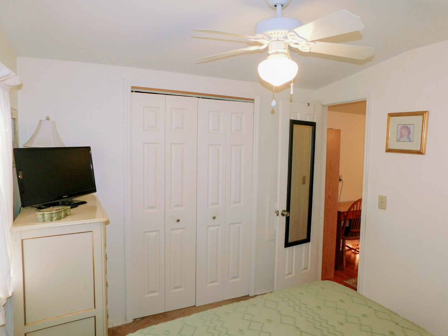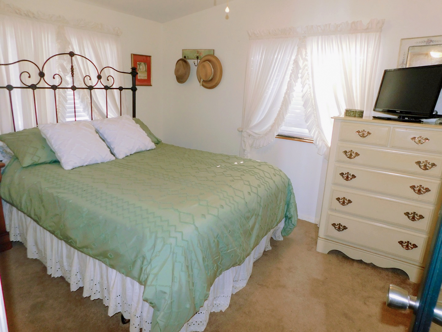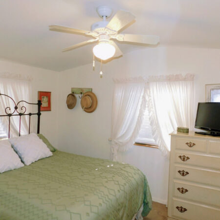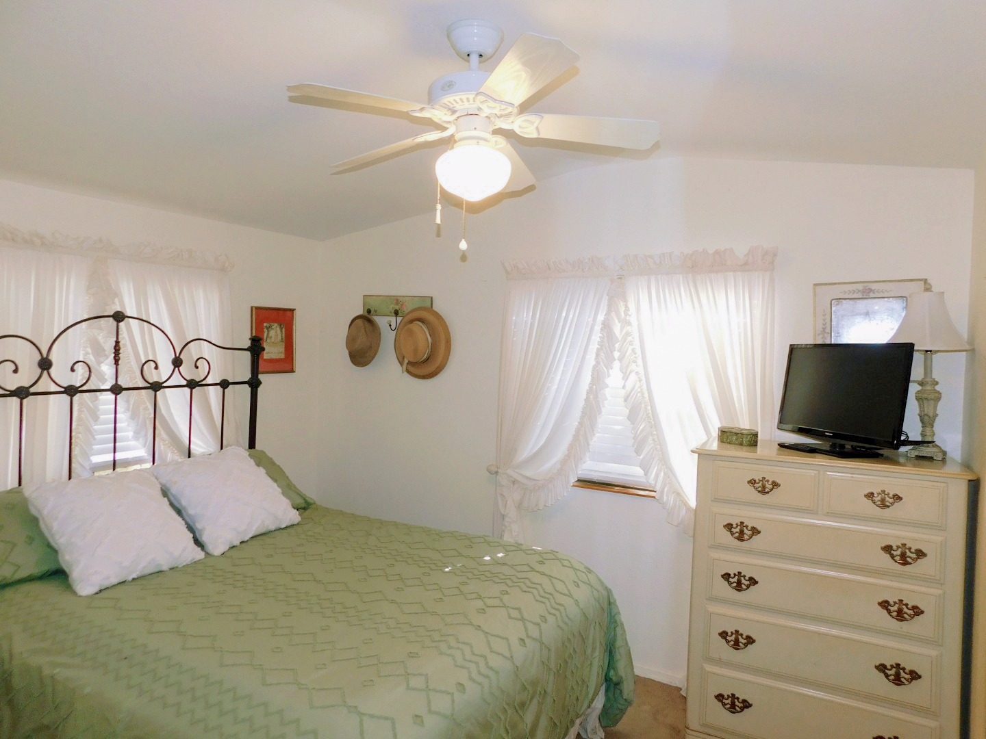 MASTER BEDROOM: Queen bed, chest of drawers, nightstand, two table lamps, lighted ceiling fan