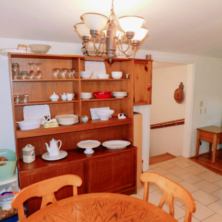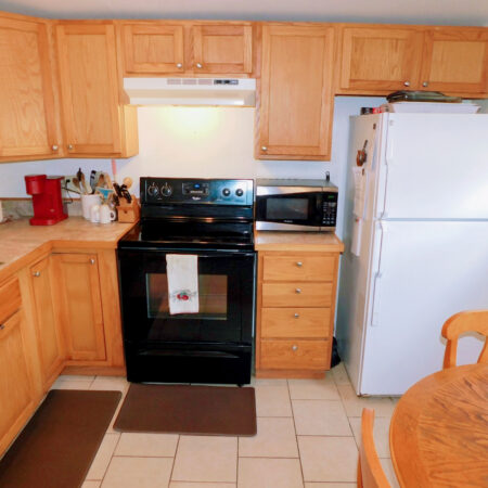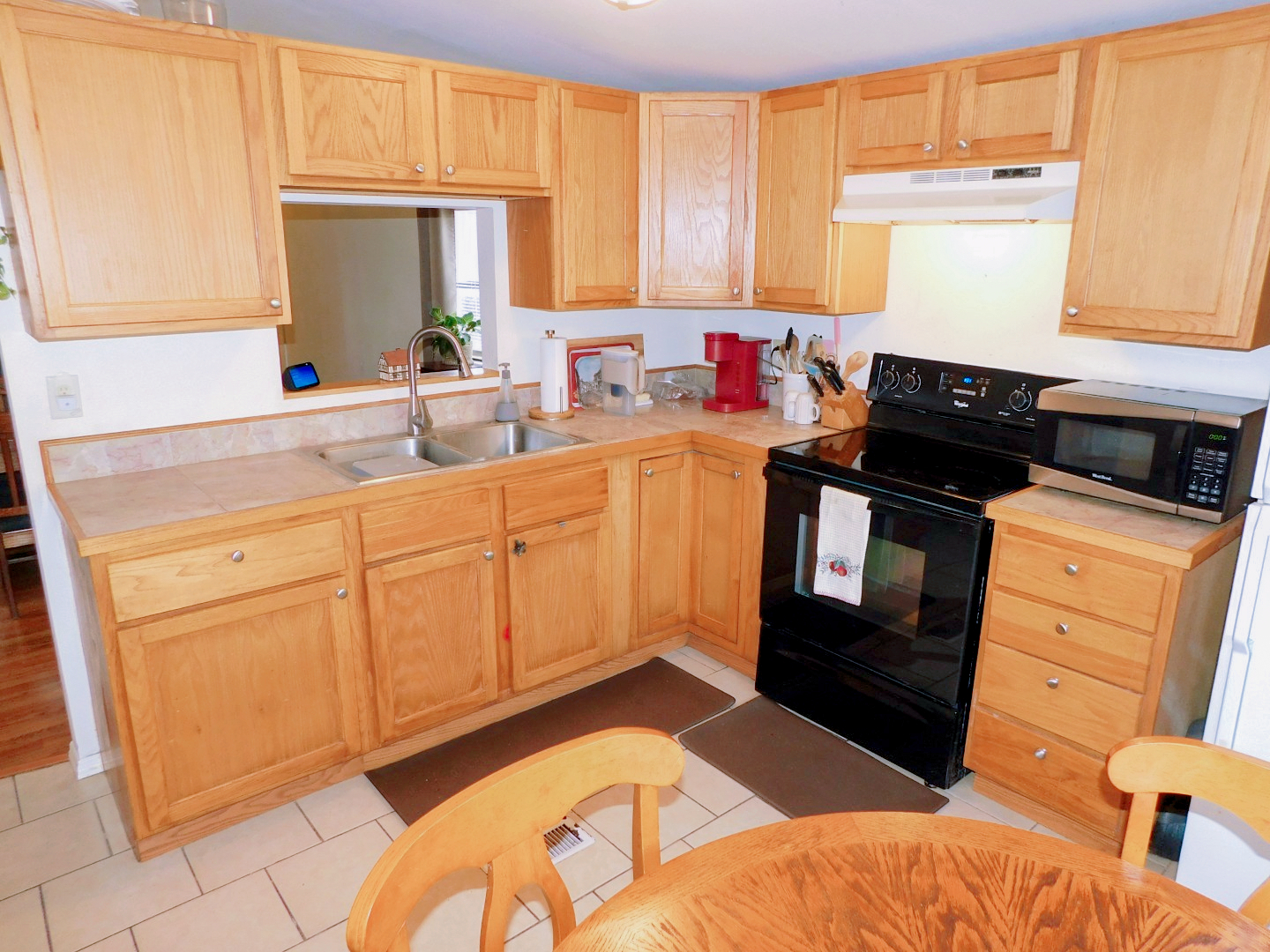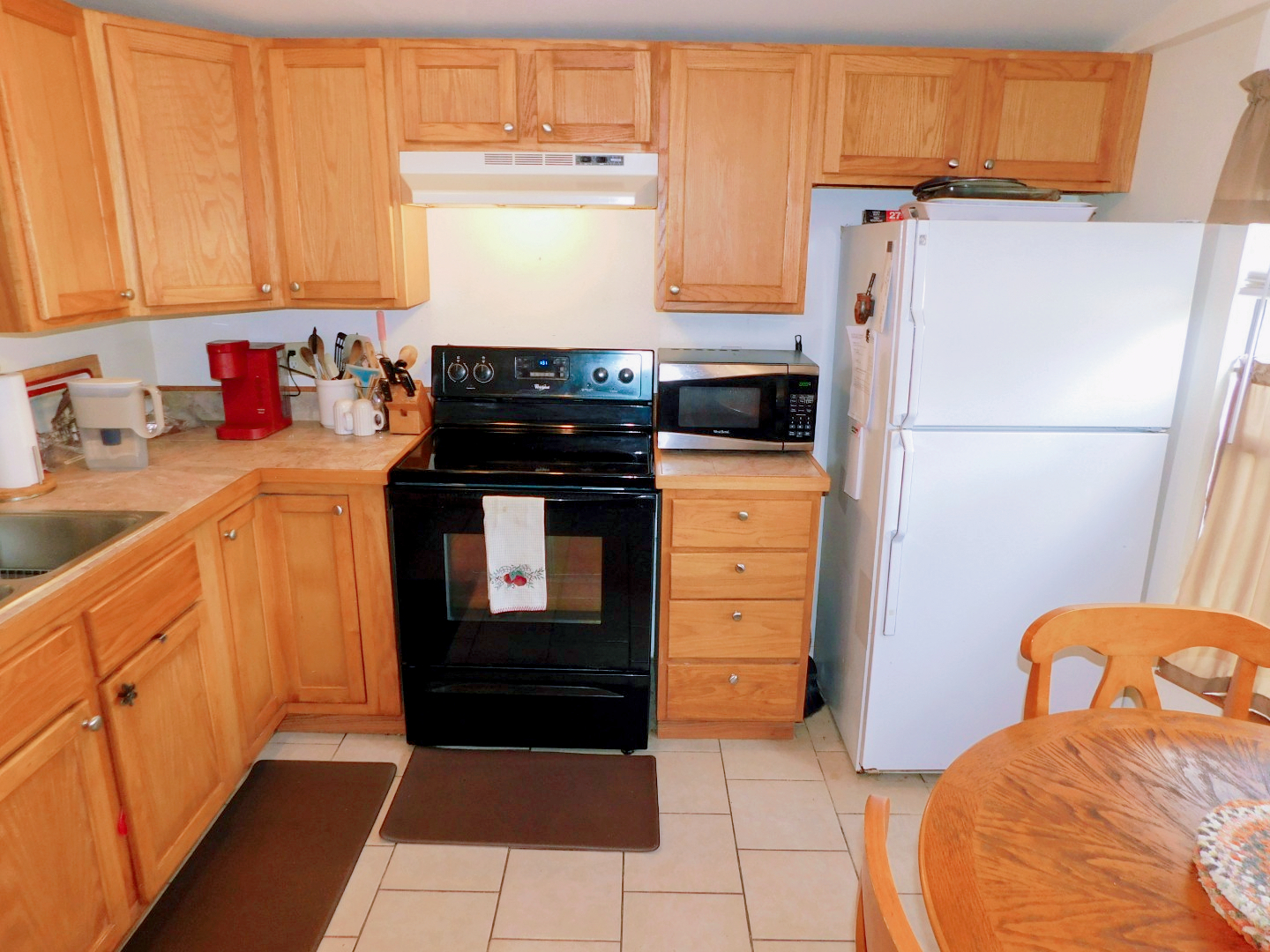 KITCHEN: GE refrigerator, Whirlpool range, West Bend microwave, pots and pans, dishware, silverware, utensils