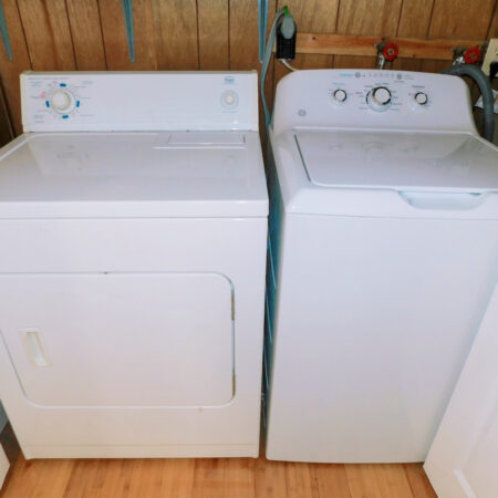 LAUNDRY ROOM: GE washer, Roper dryer, shelving