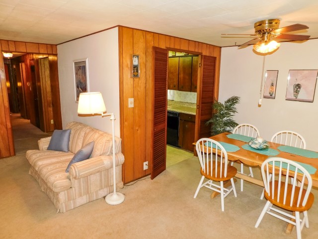DINING ROOM: Table, four chairs, lighted ceiling fan