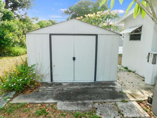 ATTACHED STORAGE SHED: Work bench, shelving