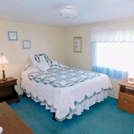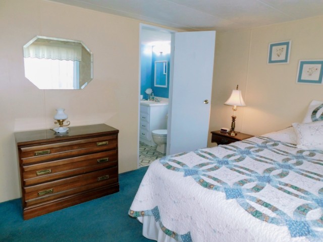 GUEST BEDROOM: Queen bed, chest of drawers, nightstand, two table lamps
