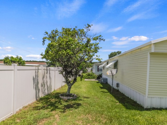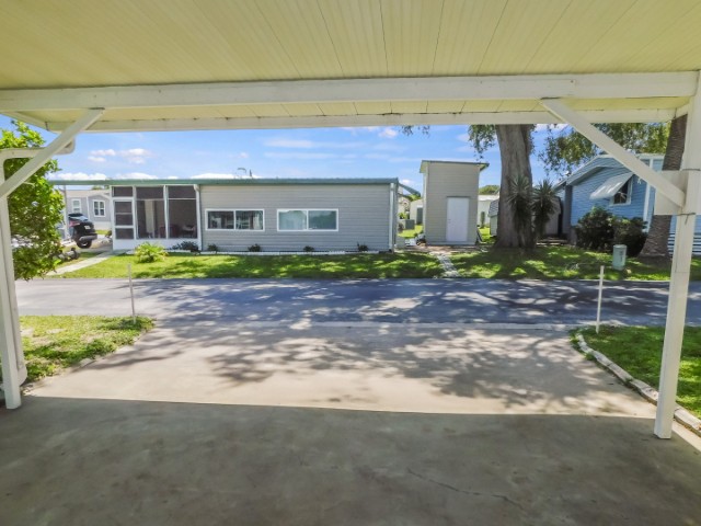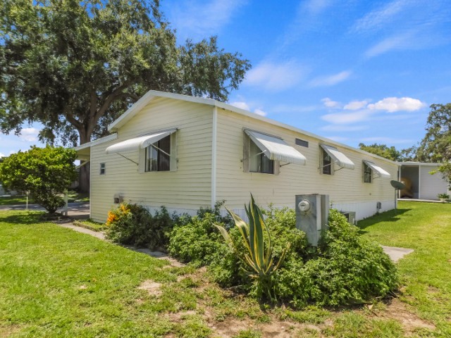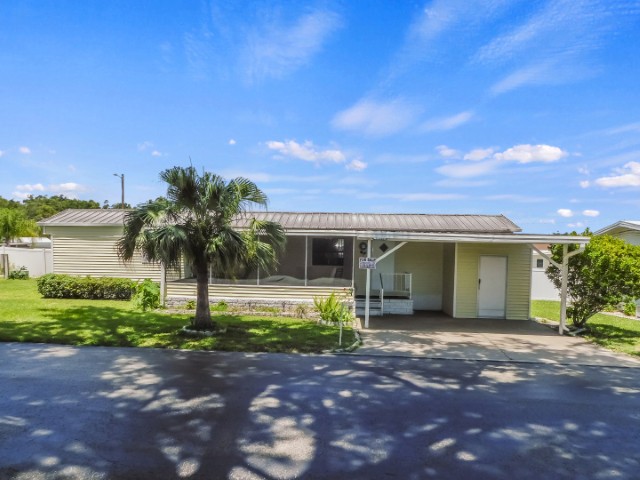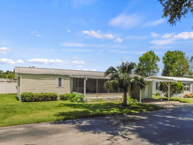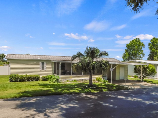 EXTERIOR: Yellow vinyl siding with white trim, metal roof, double wide driveway and carport, 6×8 attached storage shed, house situated on border lot parallel to street providing private back yard and XL front yard, lot location close to community entrance and clubhouse