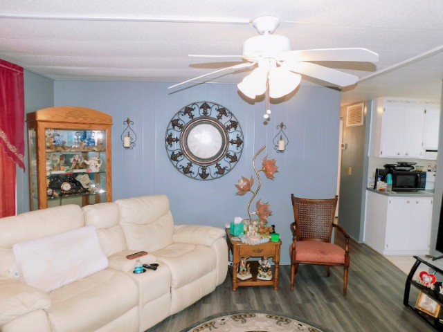 LIVING ROOM: Sofa, recliner, lift chair, two chairs, two table lamps, floor lamp, lighted ceiling fan