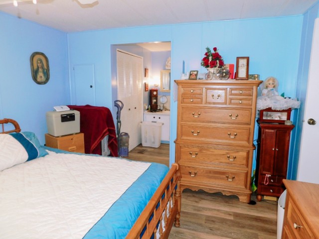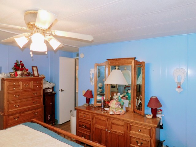 GUEST BEDROOM: Queen bed, chest of drawers, lighted ceiling fan