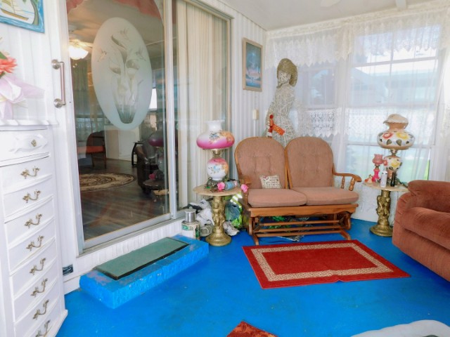 LOWER FLORIDA ROOM: Loveseat, recliner, table, chair, TV and stand, lighted ceiling fan