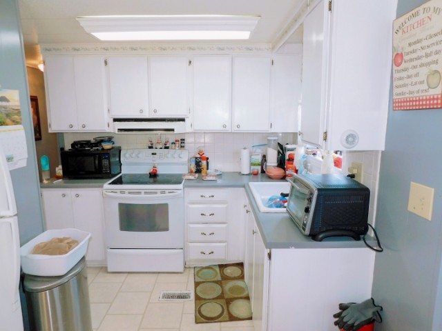 KITCHEN: Whirlpool refrigerator, Kenmore range, Faberware microwave